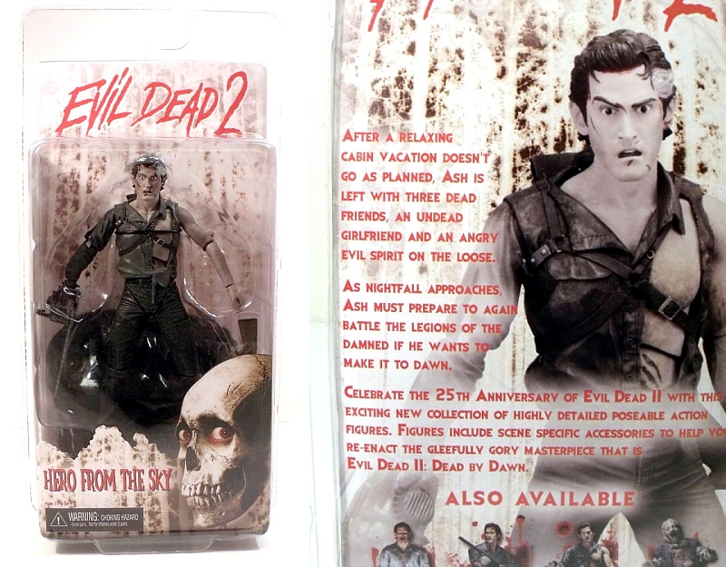 NECA's first assortment of Evil Dead II figures were incredible, but as a die-hard fan, the upcoming "Hero" Ash is the figure I've been waiting for. To me it's the definitive Ash from the movie, with boom stick and chainsaw in hand (rather, as a hand, har!). For those that can't wait until later this month for "Hero" Ash, "Hero from the Sky" Ash acts as a exciting advance debut. More than that, however, "Hero From the Sky" Ash stands apart as its own unique figure. With its cool sepia tone, display base, and Ash's now trademark white hair streak, this exclusive represents the unforgettable ending of Evil Dead II and the beginning of the equally popular Army of Darkness.