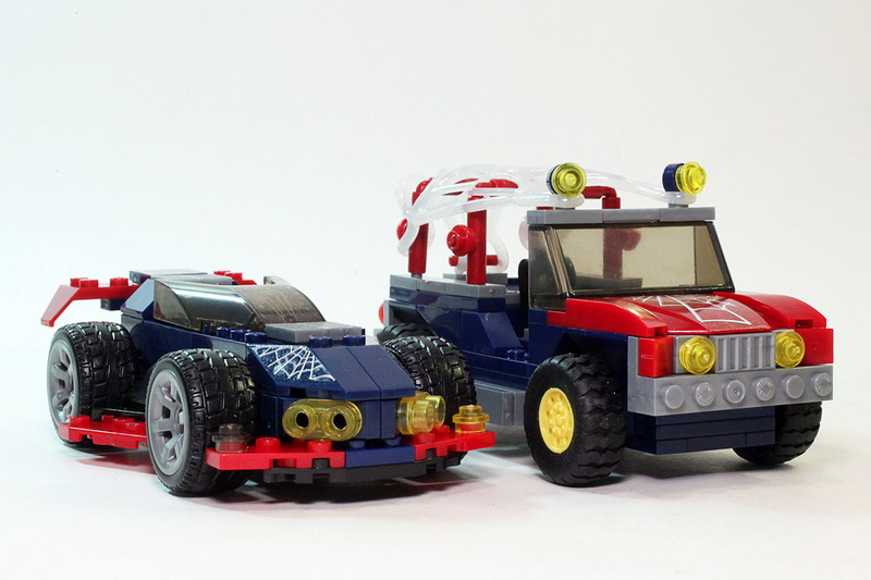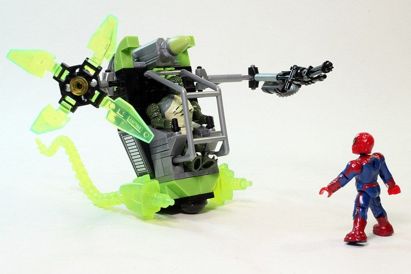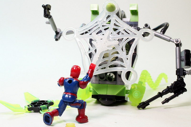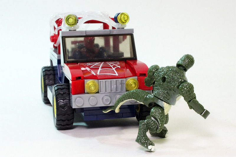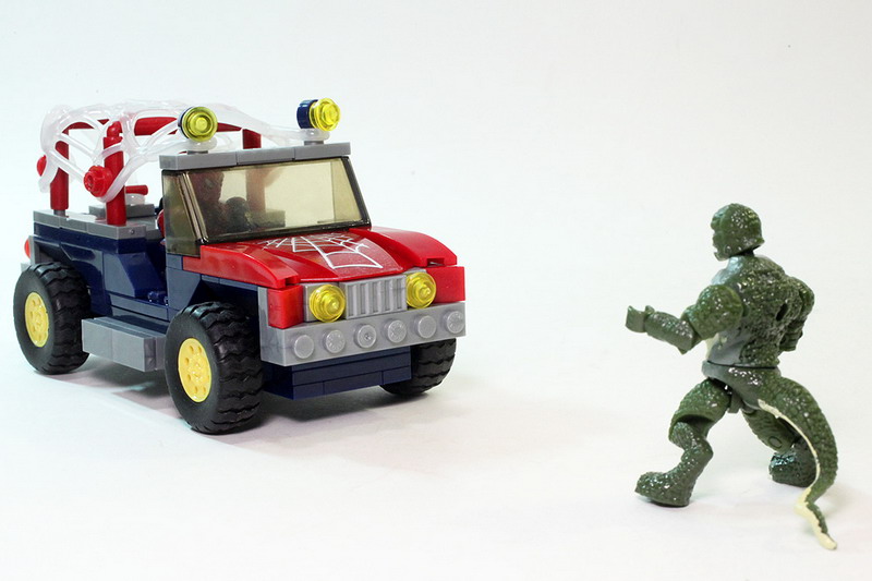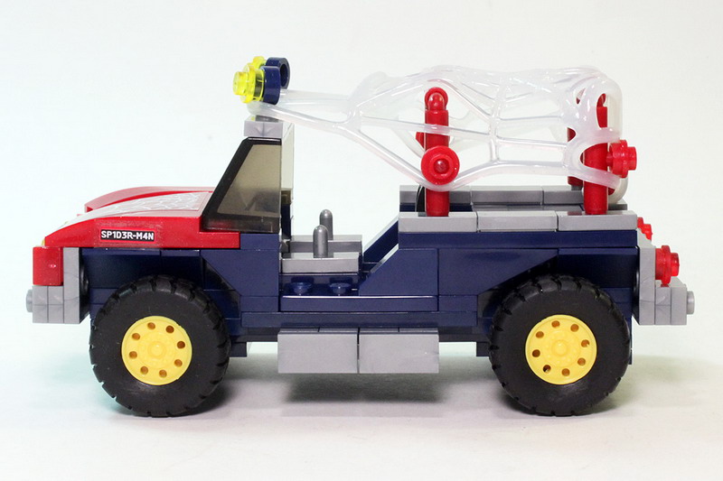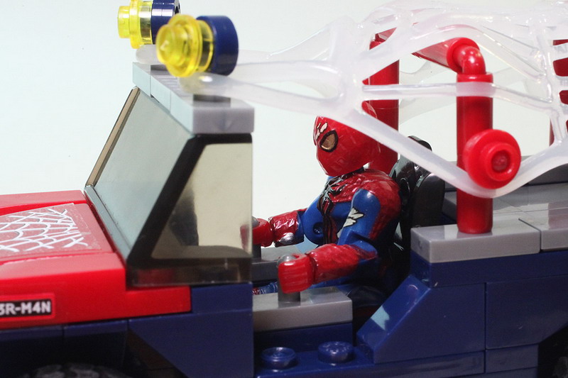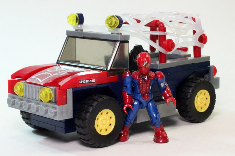 The Spider-Man Jeep is about the same size as the Speeder if you own that. Spider-Man can be inserted in comfortably under his removable web canopy. The jeep has working tires and includes some decals for the hood. I found an extra Spider-Man decal and Mega Bloks decal so I went ahead and used them too for good old fashioned product placement.