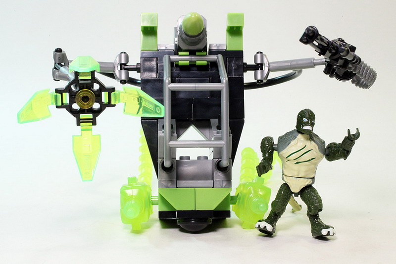There’s a cage that lifts up to insert the Lizard at the helm. Not exactly a safe machine since he’s fully exposed to gunfire. But kind of neat as it has a mech-warrior vibe to it. There is of course a hole in the back for his tail to go through. Lizard has thought it through.