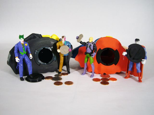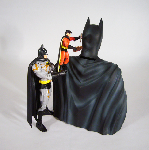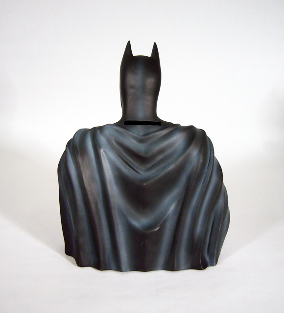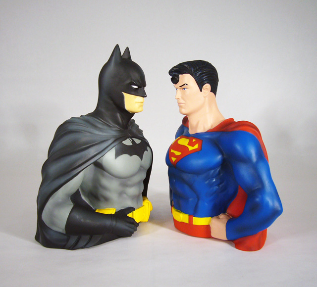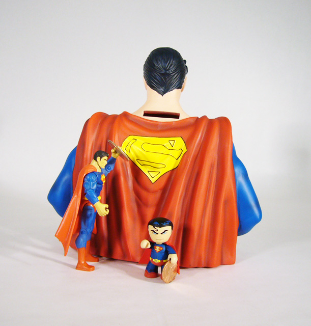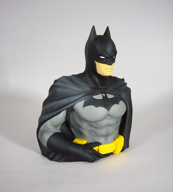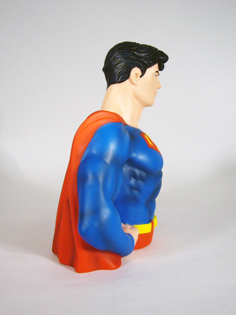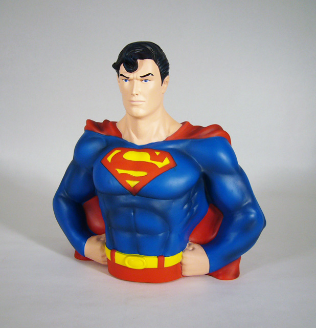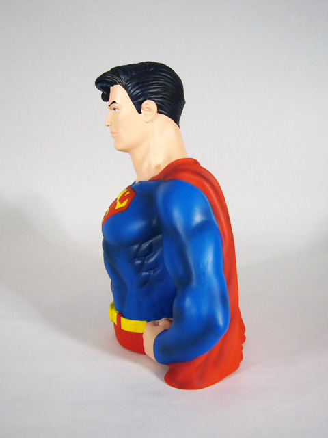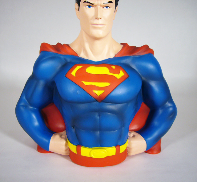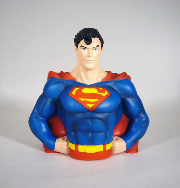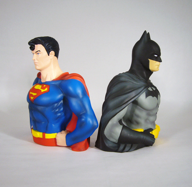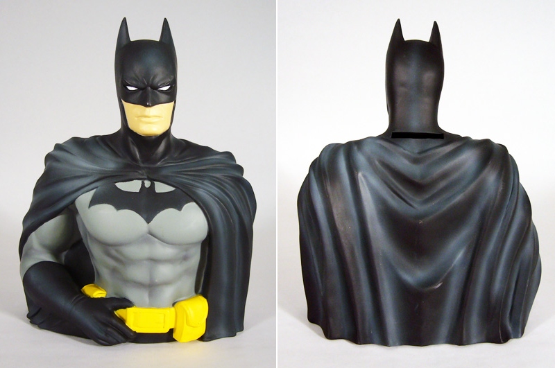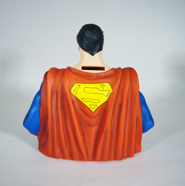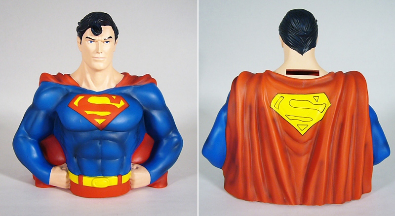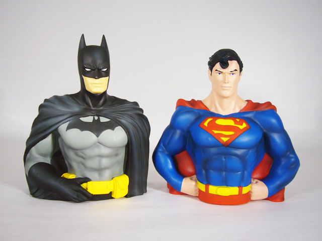 Both DC busts are, of course, banks as well. The slot for coins (or folded bills) sits high on their neck and is substantial enough to be useful but unobtrusive enough that you can’t really see it unless you’re behind them. Supes and Bats are a bit lucky in this regard since they both have capes that can help hide the slot - so much the better for you! Likewise, each bank has the unscrewable cap on the bottom so you can access your money.