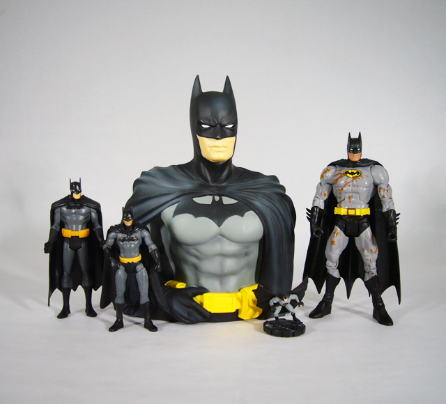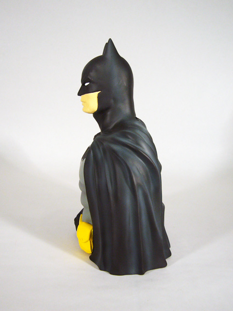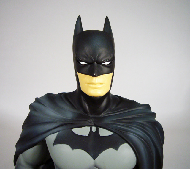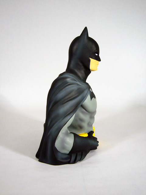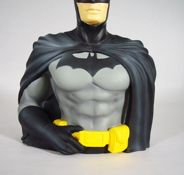 The Batman bust measures approximately 8 ½ inches tall to the tips of his bat ears and 7 inches wide. The brooding hero is posed with his right arm pushed out from his cape and his hand resting comfortably on his utility belt. The expression on his face is calm, and the overall look reminds me of Clint Eastwood asking “Do you feel lucky, punk?” Batman isn’t going to dirty his hands unnecessarily, but he’s ready to pull whatever marvelous toy he needs from his belt to get the job done. His costume is the “modern” black and gray with a plain bat on the chest and a bright yellow belt. Batman has an impressively muscled physique but it’s not overly bulky, and his face is nicely detailed with a slight scowl and furrowed brow above his white-covered eyes to show his brooding intensity. His belt is sculpted with a buckle and two visible pouches, and Batman’s cape has lots of nice folds and creases especially on the back.