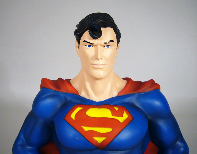 While Batman is dark and gloomy, Superman is his brightly colored opposite. At about 8 inches wide by 8 inches tall the Man of Steel stands in the classic pose we all know and love with head held high and fists firmly planted at his waist. While there isn’t as much movement to the character, you can almost feel the wind blowing his hair and cape as he stands triumphant. Superman’s chest and arms are sculpted with powerful muscles, and there’s lots of detail including his chest shield emblem and belt. You can get a hint of the Clark Kent within in his earnest expression, complete with ever so slight smile, deep blue eyes, and of course the spit curl on his forehead. Superman’s costume is as bright and colorful as ever with the red and yellow standing out strongly from a nice, deep blue. Like Batman, Superman is fully sculpted and detailed in the round with plenty of folds in his cape and the yellow shield on the back.