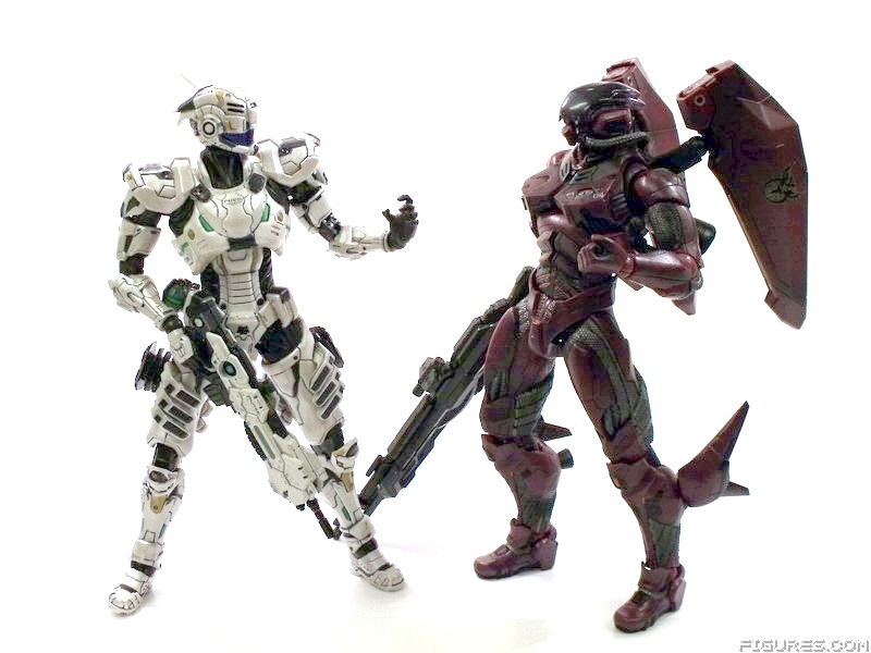 ...Bogey, another advanced Augmented Reaction Suit controlled by Vanquish's main antagonist, Victor Zaitsev. Where Sam Gideon is almost angelic in his white power armor, Bogey comes across as a red winged demon. There's a great visual contrast between Sam Gideon and Bogey - both in color and design - making each figure a unique purchase. If torn to choose just one, Bogey would be my man, but honestly they look best displayed as a pair. Where Sam's ARS is more angular and plated looking, Bogey wears an ARS that's more form fitting and biological. There's more of an underlying garment exposed on Bogey, almost appearing like muscular chainmail.