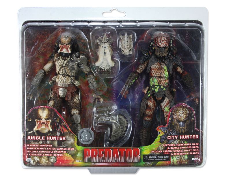 NECA provides new photos of their latest Predator action figure 2-pack. Exclusive to Toys"R"Us this fall, this 8-inch tall figure set stars a Battle Damaged City Hunter from and Battle Damaged Jungle Hunter.