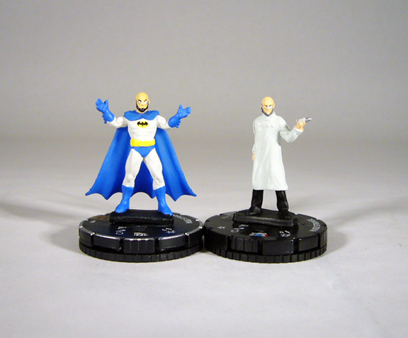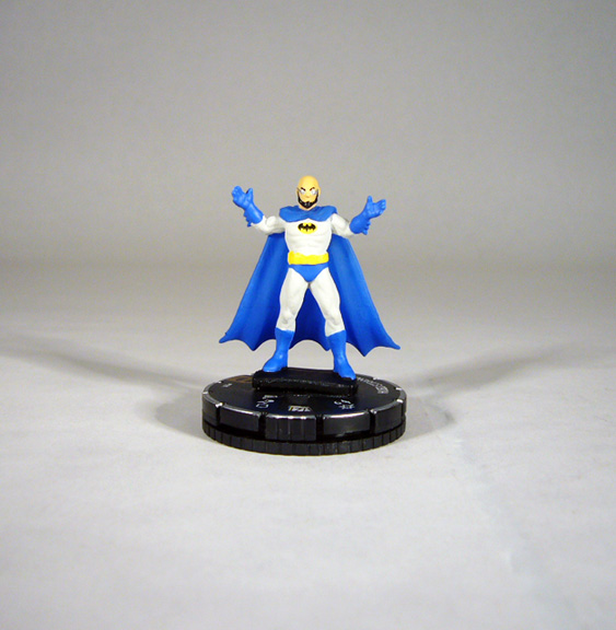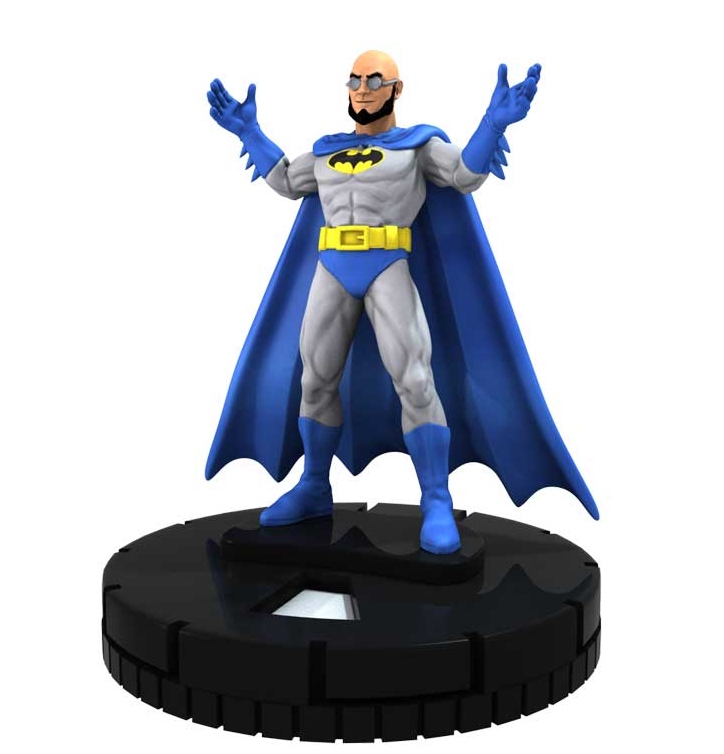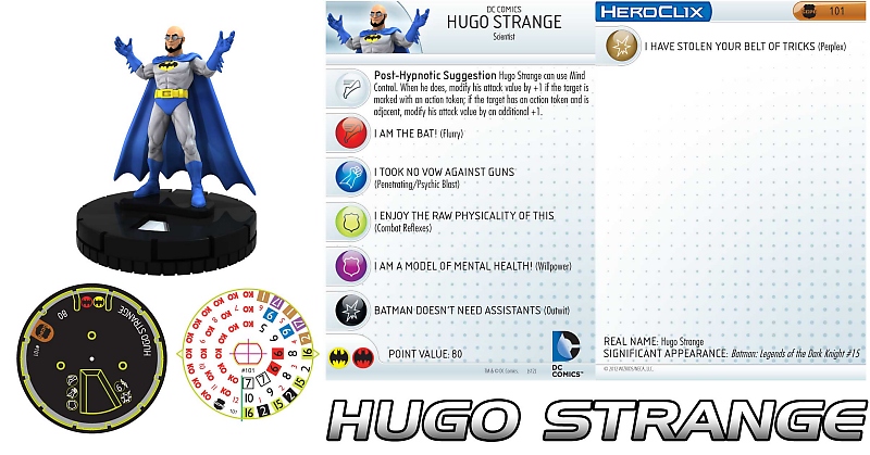 The insane professor Hugo Strange is one of Batman’s oldest villains, first appearing way back in 1940, but he only just now made his debut in HeroClix with last month’s Batman set. That version captured him in his typical “mad scientist” duds, but now he returns in one of his most iconic appearances dressed as Batman! Obsessed with the Caped Crusader Strange trains in secret and even fights crime as Batman, wearing his then blue, gray, and yellow costume. The professor may be all Batman from the waist down, but his uncovered head is... well, Strange, bald with his chinstrap beard and iconic round glasses.