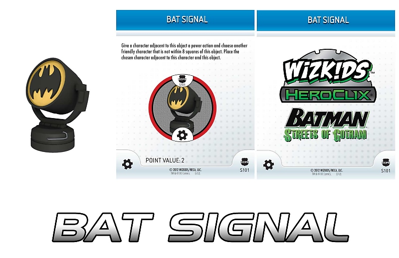 The Streets of Gotham OP kit comes with two special objects, and they are both very cool. First up is the Bat Signal finally making its object debut in HeroClix! This 2 point heavy object recreates the modified searchlight from the comics complete with a circular base and barrel-like light. A dark gray-green, the Signal features a big bat symbol over a translucent yellow lens through which you can see a silver paneled interior. The reverse side of the Signal has some cool circuitry designs and more silver accents. While usable as a heavy object, the Bat Signal can also be used in a very thematic way. Give a character adjacent to it a power action and “summon” a friendly character (who was further than 8 squares away) next to it!