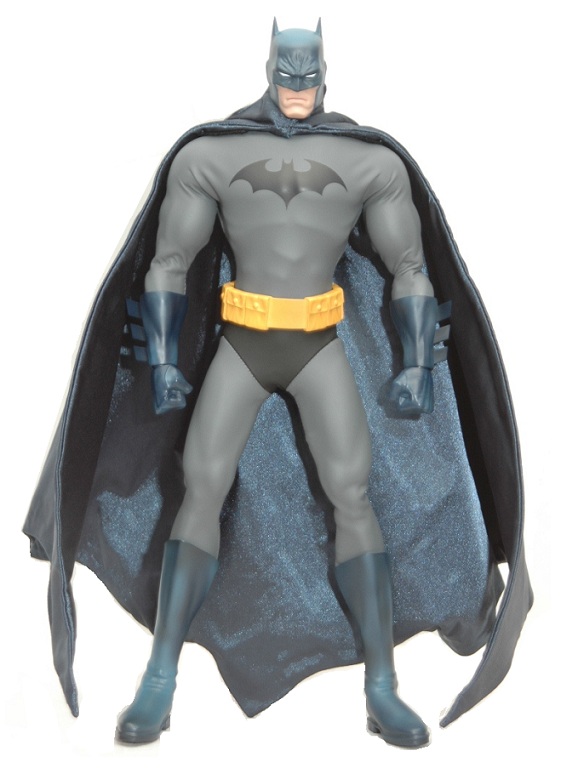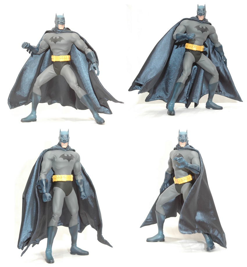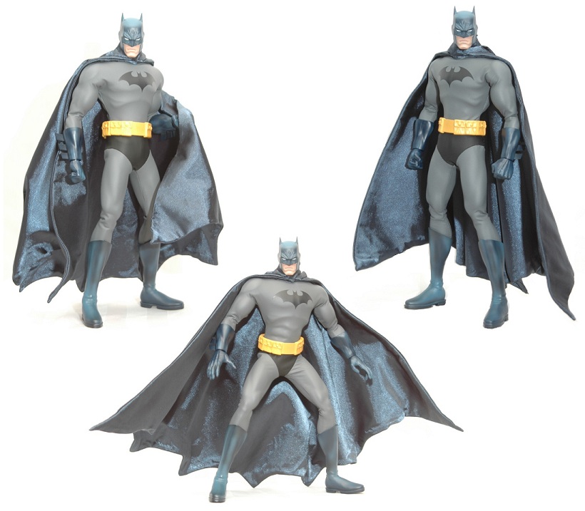 The one-piece bodysuit fits tightly over the 12" body to ensure the sculpted musculature shows through the suit. Unfortunately, this also means the bodysuit limits the articulation due to its tight design. The bodysuit's color scheme accurately captures the Lee design and includes the the light gray bodysuit accentuated by the black bat symbol and shorts, the bright yellow utility belt, and the dark blue cape.