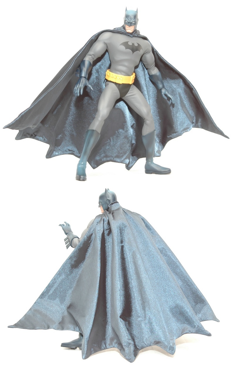 The cape, which features a wire armature throughout the outside hem (allowing for dynamic posing) is well made and is reminiscent of Bob Kane's original Batman design. The cape attaches to the shoulders using velcro which thus allows for the figure's cape to flow in unique ways similar to the look of the character in the comic. While each artist draws Batman's cape differently, Lee's signature style - large, draping and wind-blow - is, thanks to the wire armature, able to be fairly well replicated here.