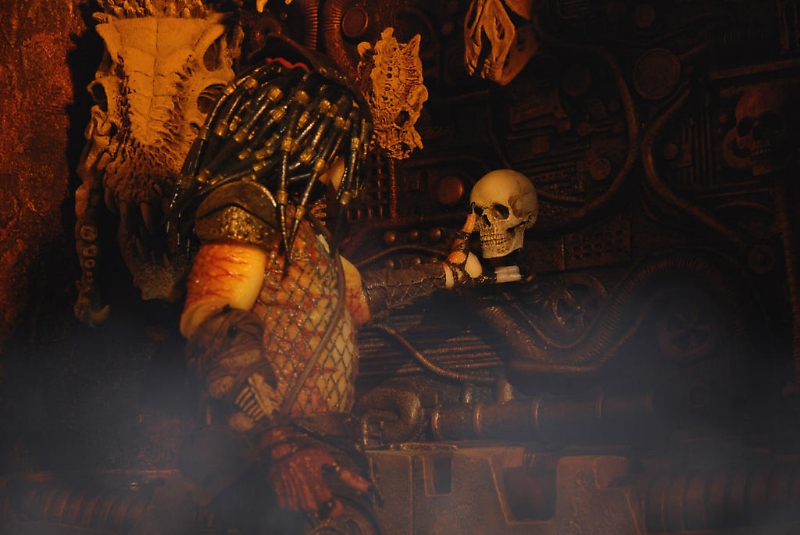 The wall, seen at the end of Predator 2, shows off the many skulls the Predators have collected from hunted creatures across the universe, including a xenomorph from Aliens. Since 2010, NECA has slowly been releasing trophy skulls as part of their Predator Toys"R"Us 2-packs and San Diego Comic Con exclusives. NECA's trophy wall will not only give collectors a place to display all their skulls, but it will include a few to complete the collection - such as the monstrous skull pictured above left. Full details and specs to be announced at Toy Fair this February.