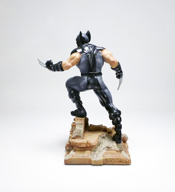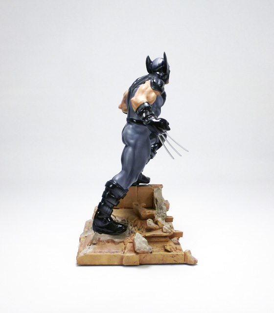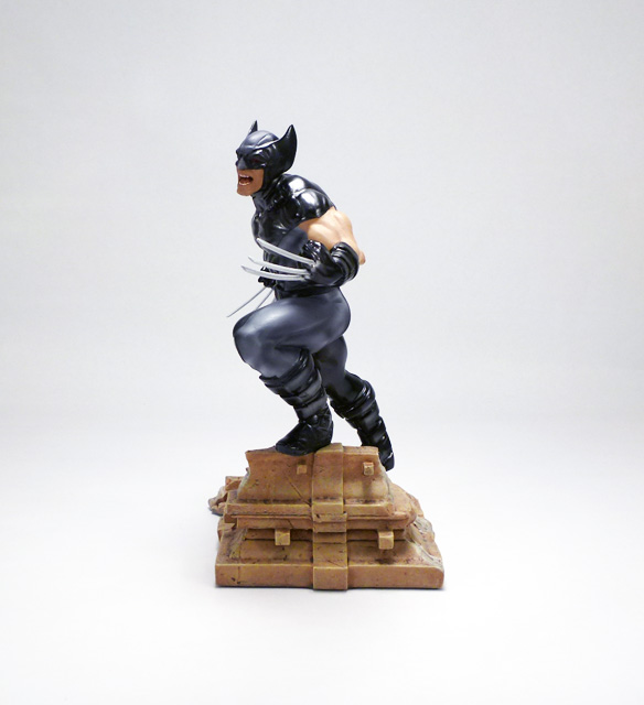 Following the theme of the X-Force series Wolverine is depicted standing in rubble, ready to leap at his next foe. The mutant stands 10 ½ inches tall, in 1/6th scale with teammates X-23, Warpath, Deadpool, and Archangel. Never one to lead from the rear, Wolverine clambers over the debris of a building, climbing to the top of a low wall. With his left foot raised and his right leg stretched out behind him, the Uncanny X-Force leader rotates to his left. He spreads his arms asymmetrically with the left one a bit higher than the right, each ending in clenched fists. Wolverine twists his neck even further to the left to get a better look at his target, stretching out his neck.