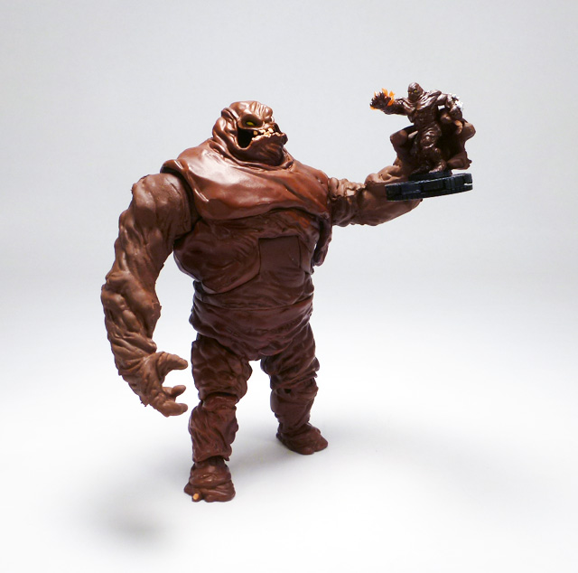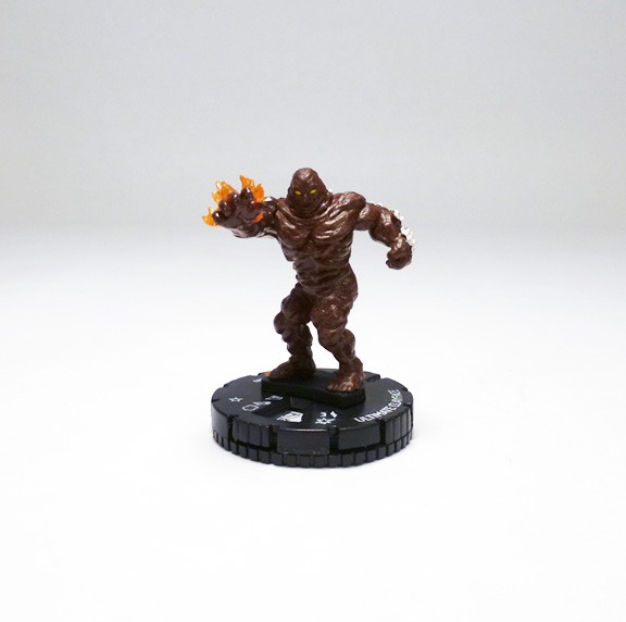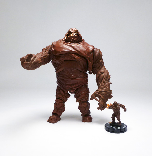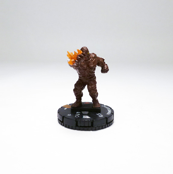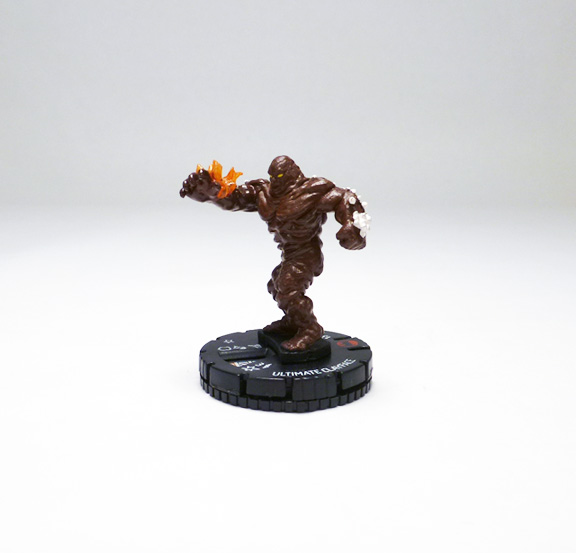A couple of different Clayfaces have appeared in HeroClix before, but nothing like this powerhouse! Ultimate Clayface has the familiar shape of a humanoid made of dark brown mud with a huge upper body and relatively smaller legs. The villain twists at the waist, lunging forward to grab at the Dark Knight with his right hand while his left clenches into a fist behind him. Karlo features a gruesomely intricate sculpt of sloppy, flowing mud with a couple of specific aberrations. Across his back and left arm are white crystalline quartz structures while his right hand is wreathed in translucent orange flames, and his face has a mud-packed nose and open mouth with tiny sculpted teeth! Finally, in addition to the brown, white, and orange, Ultimate Clayface has creepy yellow eyes.