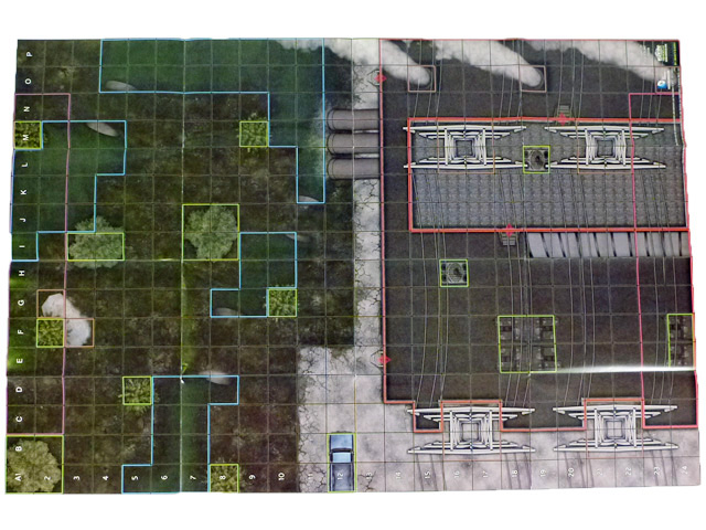 Should an earthquake occur during your match (a 3 or less on a 2d6 roll at the end of each player’s turn), flip the map to reveal Gotham City Power Plant: Post-Cataclysm! On the one side, a large portion of the power plant building has collapsed, leaving a different pattern of elevations - but surprisingly little hindering terrain. Meanwhile, Mr. Freeze has created an ice castle next door to oversee the operations (see Batman: Legends of the Dark Knight #121)! Another multi-storied structure, the castle has lots of stairs, several elevation 3 towers, columns for both hindering and blocking terrain, and a really look with icy surfaces. The cold and ice has even frozen the environs, blanketing everything in gray and eliminating the foliage and water terrain.