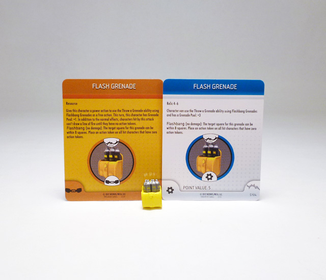 In play they can be used as either a 5 point Relic (picked up on a roll of 4-6) or attached to the Belt as a Resource for 1 point. Both versions give a character access to a new grenade type called, appropriately “Flashbang.” While they do no damage, Flashbangs target a square within 8 range and apply a token to all hit characters who have no tokens. The Relic version gives a character the Throw a Grenade ability (Flashbangs) and +3 to his or her Grenade Pool. Meanwhile, the Utility Belt resource provides a steady supply; all the character has to do is be given a Power Action to throw one (with +1 to Grenade Pool that turn). In addition, characters hit by the Flashbang can’t draw line of fire until cleared!