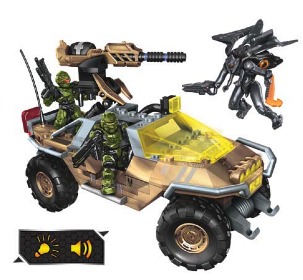 The UNSC Gausshog is the light anti-armor variant of the Warthog LRV. Equipped with a 360° rotating Gauss Cannon, real working suspension and specially engineered floodlights, the Spartan Pathfinder and his Spartan gunner open fire on a Knight Lancer armed with a Suppressor. Now in desert camo with light features and in-game sounds, the Mega Bloks UNSC Night Ops Gausshog lets you play more than ever before! Approximately 220 pieces.