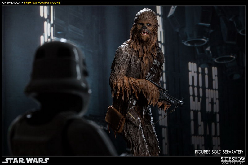 Sideshow has released new photos and details on their latest Star Wars Premium Format Figure: Chewbacca. Standing over 23 inches tall, the regular and Exclusive versions of Sideshow's Chewbacca Premium Format Figure will be outfitted with his signature bowcaster and satchel. The Exclusive Chewbacca Premium Format Figure will include an additional switch out hand, arming Chewie with a Blastech DLT-19 Rifle.