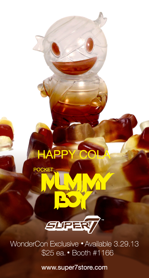 * POCKET MUMMY BOY VINYL FIGURE (“Happy Cola” Wondercon Exclusive): Super7’s mini-mascot MUMMY BOY is rendered is squishy-soft translucent vinyl, in order to replicate the look and feel of a giant piece of GUMMI COLA candy! A gooey 3” tall Wondercon Exclusive, packaged with a header card inspired by the crazy-delicious Japanese candy Haribo Happy Cola!