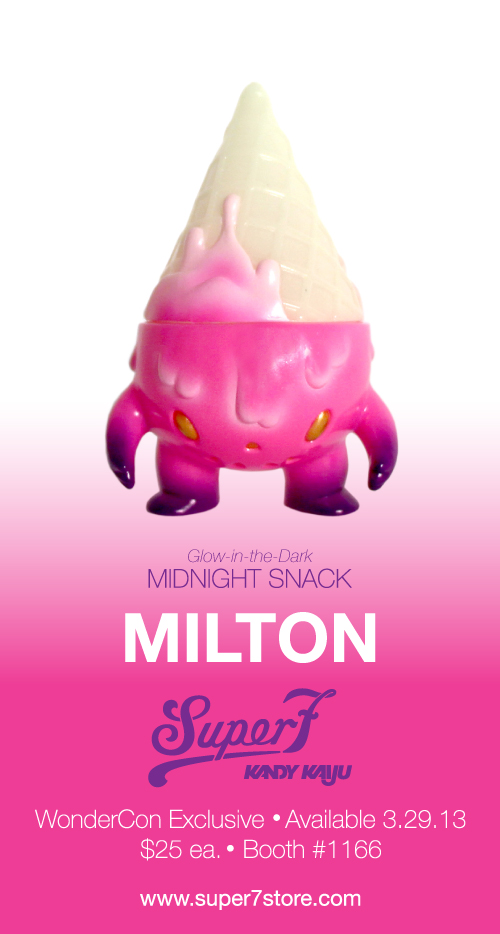 * KANDY KAIJU: MILTON VINYL FIGURE (“Midnight Snack” Wondercon Exclusive): From the haunted bakery to your shelf - the Kandy Kaiju are monstrously cute confections. But be careful as you won’t be able to eat collect just one of these 3” sized Japanese vinyl figures! Here comes MILTON - Everyone's favorite living, walking, melting - and glowing - Ice Cream Cone! Eat this Wondercon Exclusive with the lights down low so you can see the toy Glow-in-the-Dark. (But seriously, don’t eat him. He’s a toy.)