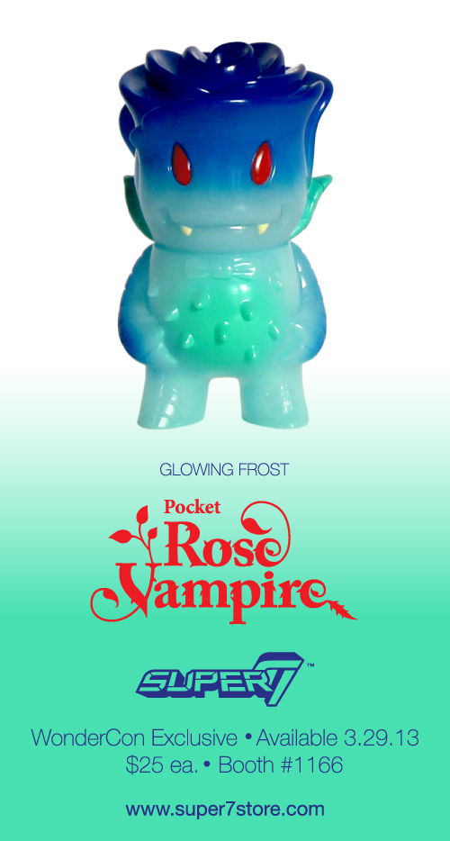 * POCKET ROSE VAMPIRE VINYL FIGURE (“Glowing Frost” Wondercon Exclusive): From deep underground the Rose Vampire grows to stalk the living! The Pocket-Sized Roseferatu is small enough to travel with you - to anywhere there is something in which to sink his fangs. Cast in Glow-in-the-Dark vinyl! Joshua Herbolsheimer’s terrifyingly cute creation measures 3” tall of pure Japanese vinyl goodness. Don’t miss out on this Wondercon Exclusive rendition of one of Super7’s most popular characters!