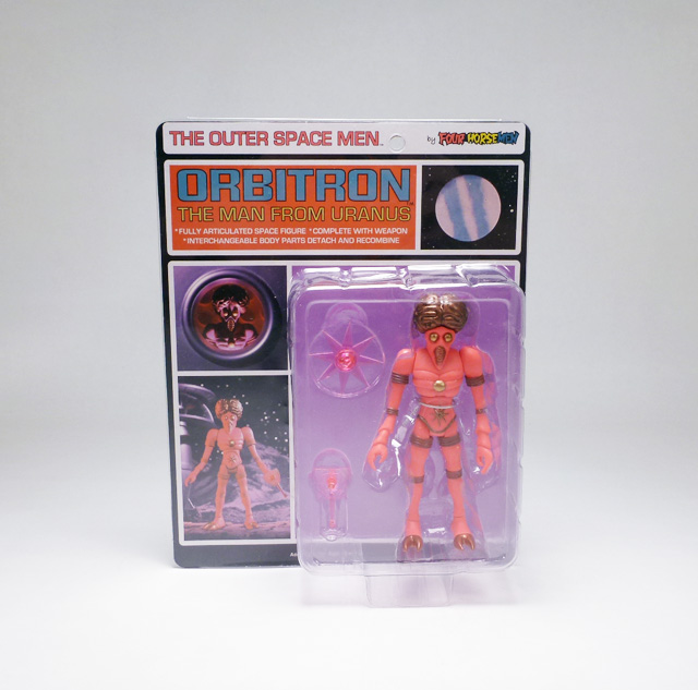 All outliers among the Outer Space Men crowd, the Alpha Phase astronauts are either shorter or taller than the standard 3 ¾ inch figure height with Gemini at 3 ¼ inches, Orbitron at 4 ¼ and the hulking Cyclops towering over the rest at 5 inches (5 ¼ with his helmet on). As spacemen they all have unique retro sci-fi elements, usually involving some sort of bubble or bullet-style helmet, a spacesuit with various doodads, and of course cool space weaponry. All of the figures have (at least) radically different head sculpts, if not entirely different bodies as in the case of the Alpha Phase and Deluxe characters who differ greatly from the standard humanoid spaceman bodies. Infinity Edition Alpha Phase Wave 5 brings you the “brainy” Orbitron (the man from Uranus) and the freaky little Gemini (the man from the twin star Algol), while the Alpha Phase deluxe figure is the mighty Cyclops, the giant from beyond the Milky Way!
