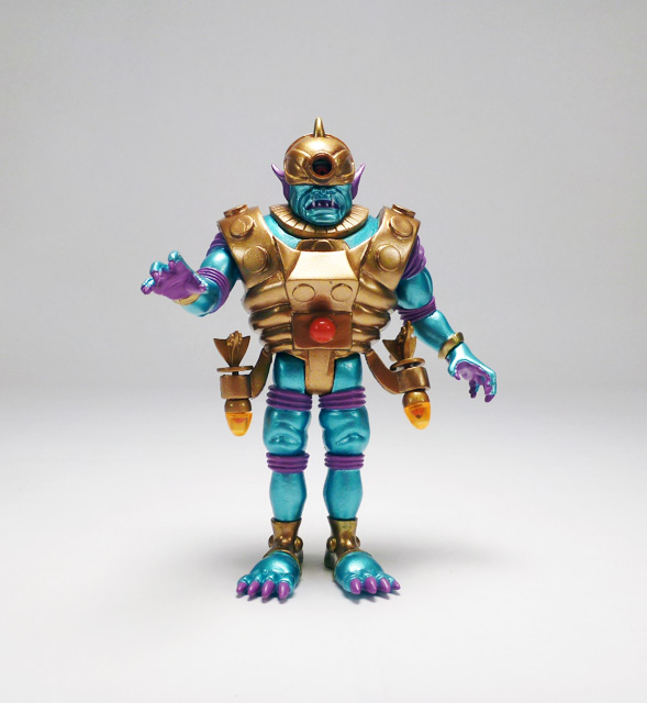 The last time we saw the Alpha Phase aliens they were done in translucent colored plastic. Those were fun, but now in the new Infinity Editions they have fantastic and highly detailed paint jobs! Orbitron trades in his clear pink coloring with blue orbs for a fresh, fleshy salmon color with a dark purple on the bands on its arms and legs. Meanwhile, the Man from Uranus has a shiny copper sheen on his foot claws, lower torso decoration, mouthpiece, and giant exposed brain, while his eye and chest orbs are bright gold. Little Gemini was an eerie yellowish-green in the first version, but now rocks a bright yellow spacesuit with black joints and translucent red nodes surrounding his torso. Remove the twin orange dome helmets to reveal the alien’s shiny silver heads and black beady eyes. And then there’s Cyclops! Last time we saw him he was a full body translucent blue along with his armor, with an orange eye and some green in his helmet and guns. The new Cyclops really needs to be seen to be appreciated; he’s a stunning mix of pearlescent blue and matte purple, with accents like armor, decorative elements, and his horn in gold. The giant’s solitary eye also gets an upgrade with a three color paint job: white sclera, orange iris, and black pupil.