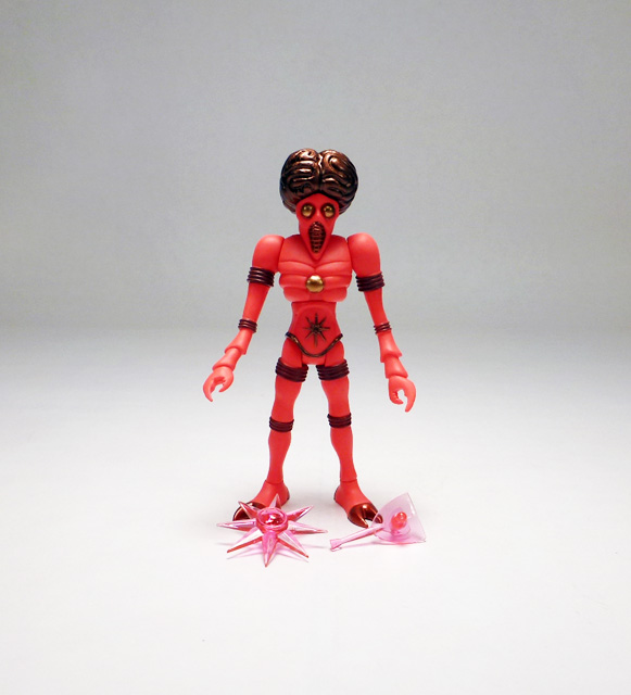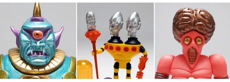 Since they come from the Four Horsemen, the Outer Space Men of course have fantastic sculpts, especially for their 3 ¾ inch scale size. As noted above, each of the Alpha Phase aliens are unique with wholly individual sculpts. Starting big we’ve got the massive and mighty Cyclops, a figure with a really interesting sculpt and lots of details. He resembles a space gladiator with traditional armor that shows off his huge muscles; his oddly-shaped giant head has one huge eye, a mouth full of vicious teeth, pointed ears, and a horn with which to gore his enemies. Orbitron is a classic design highly reminiscent of the Metalunans from This Island Earth with a giant exposed brain, spherical eyes, an emaciated body with intricate designs, and long, thin limbs that end in pincer claws. Finally there’s the weirdest one of the bunch, the diminutive Gemini. The little guy has tiny legs and arms and a wide torso with a flat top, growing two pointy-eared cone heads encased in test tube-like helmets.