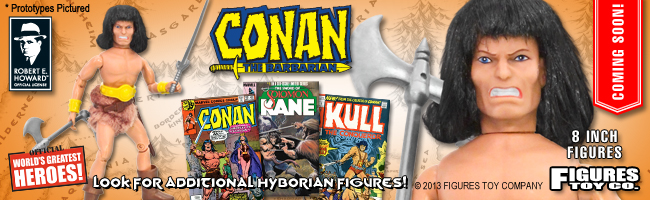 These action figures are based upon the comic book series by Robert E. Howard. Conan The Barbarian is an exact replica of the original action figure that was released by Mego. Both Solomon Kane & Kull The Conqueror are Figures Toy Company originals. All three will be available in 8 inch only.