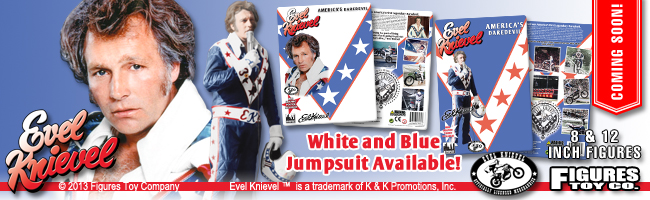 These action figures are based upon two different time periods in Evel Knievel's career. The first is from his Caesar’s Palace jump in 1967, and the second is from his Wembley Stadium Jump in 1975. Available in both 8 inch & 12 inch.