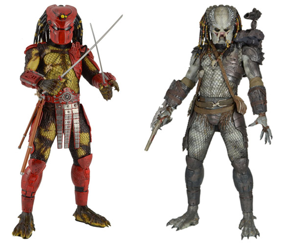 NECA has posted photography of their latest batch of quarter scale Predators scheduled to ship this August. These 19-inch tall action figures include Big Red from the classic fan film Dead End and the Elder Predator as seen in the epic conlusion of Predator 2. Big Red, wearing his vibrant red armor, includes 2 pairs of hands and 2 swords w/ sheaths with incredible detail and decoration along with separate fabric body netting. The Elder features new and improved detail and sculpting and includes interchangeable hands, sword and pistol along with a new shoulder cannon, belts and straps.