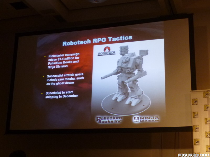 - Robotech miniatures are back in a huge way thanks to the Robotech RPG Tactics Kickstarter! Ninja Division and Palladium Books will be debuting the first minis at Gen Con next month, and there will be tons of products on the way including rare mecha, units from all generations, etc. One fun note: at this point of the presentation Tommy showed two photos of Robotech minis on display; they were both from my coverage of the Ninja Division booth at this year’s GAMA trade show (see it HERE)!