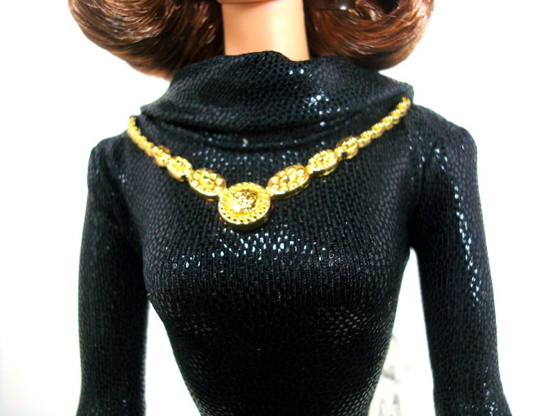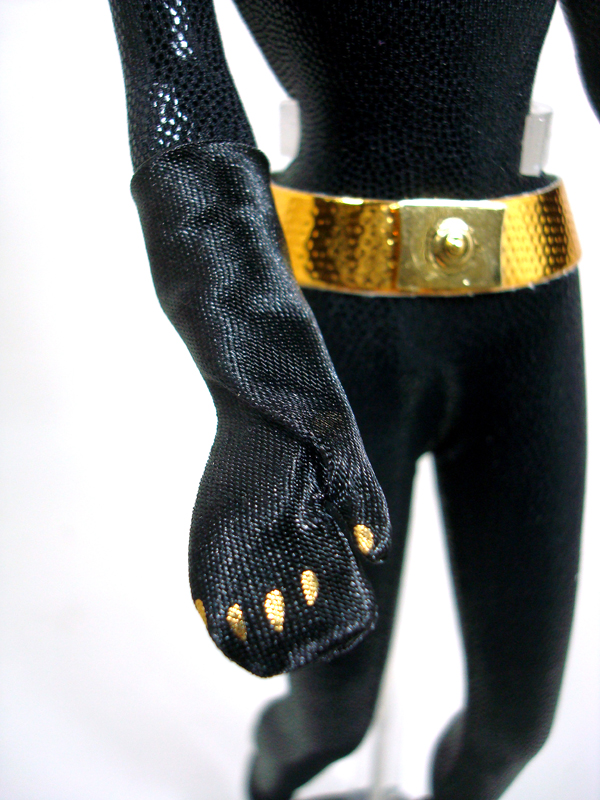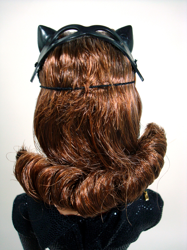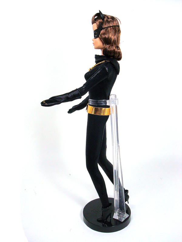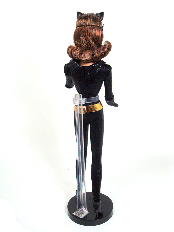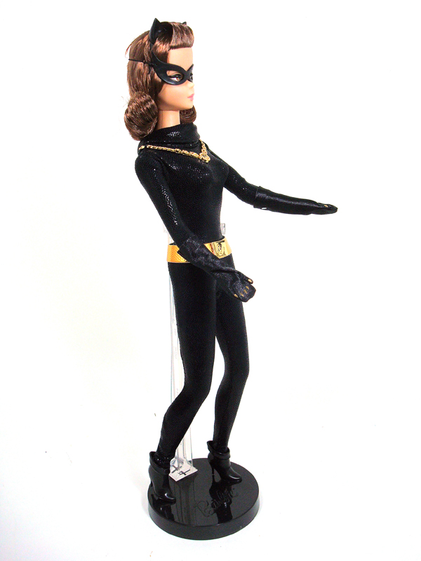 The doll itself has a standard Barbie body with articulation on the neck, arms, and legs and rooted hair. The costume is fairly accurate to the show and consists of a 1-piece “cat” suit, gloves, shoes and a removable belt. Her necklace is a separate piece, but is sewn into her costume. Her mask and cat ears are also sewn into her hair, so while you can move her mask up onto her head, it is not removable. While Julie Newmar inspires the doll’s likeness, I don’t really see her there. The doll looks more like the original 1959 Barbie with a Catwoman costume on, then the actress herself.