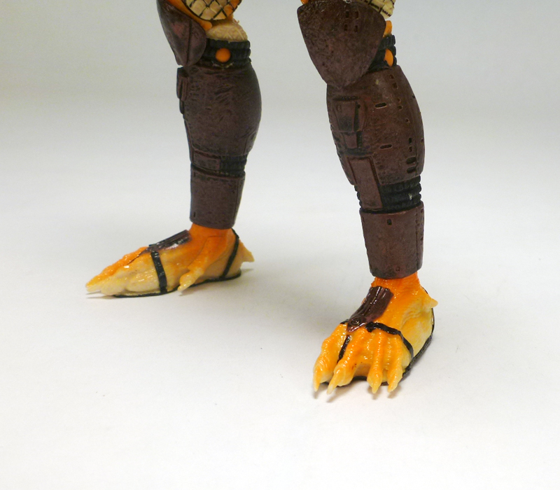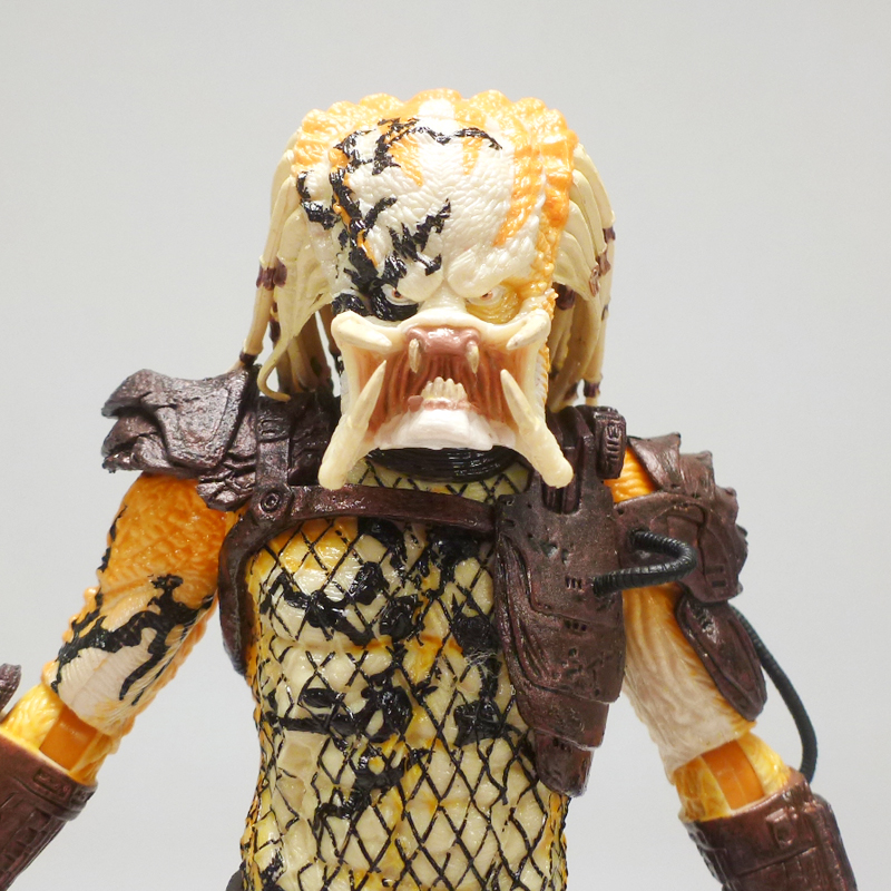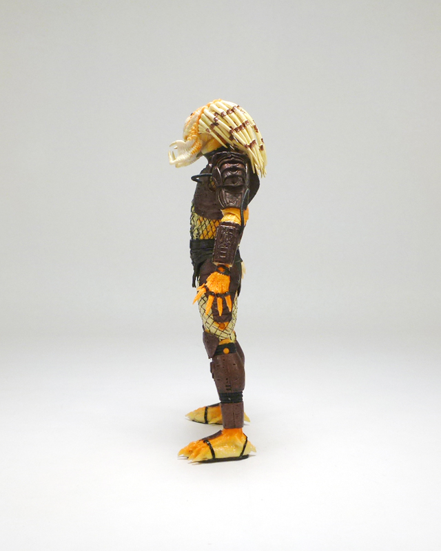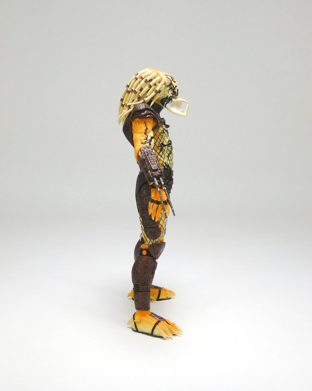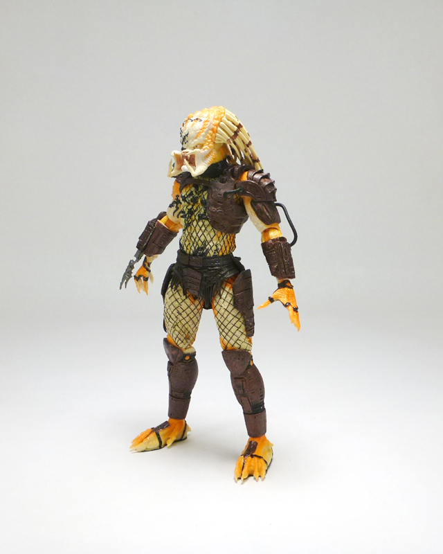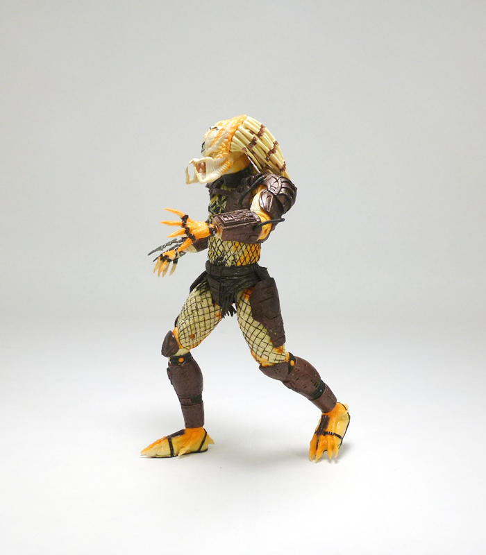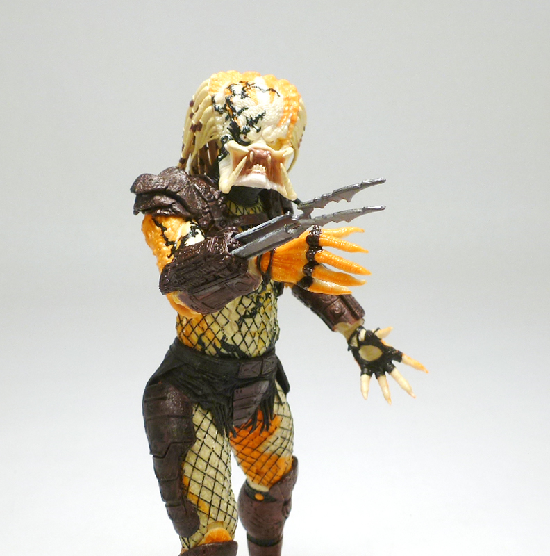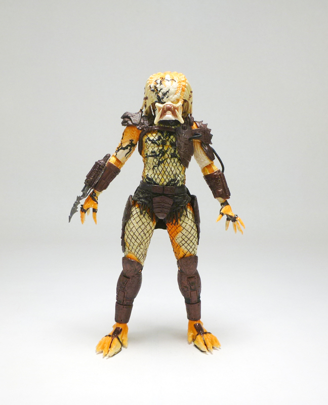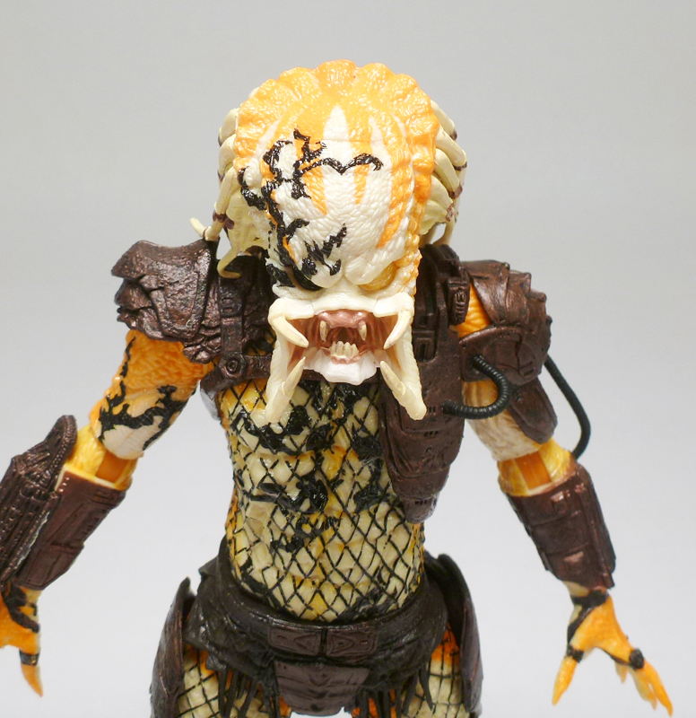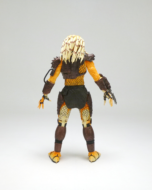 Beneath its coloring the Albino looks like most other “standard” Predators, a scaly humanoid with clawed hands, massive feet, and a monstrous head. The action figure has a fantastic sculpt accenting the texture of the Predator’s lumpy body and fishnet outfit, and on top of that is the intricate armor stylings on his greaves, belt, thighs, forearms, and chest harness/shoulders. The head has an outstanding sculpt as well, capturing the fearsome face with its sunken eyes, massive forehead, and open mandibles. Of course what really sets the Albino apart is his coloration, a very interesting mix of white at his core radiating outward to a fiery orange, as well as a smattering of black tribal tattoos. The changes in colors is nicely asymmetrical across the body, and the head in particularly has cool splotches and variegated white, orange, and black that draws in the eye. The Predator’s armor and clothing is mostly dark brown with some black, letting the Albino’s unpigmented skin shine through.