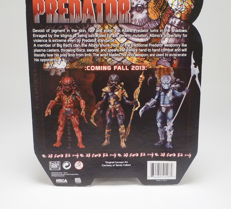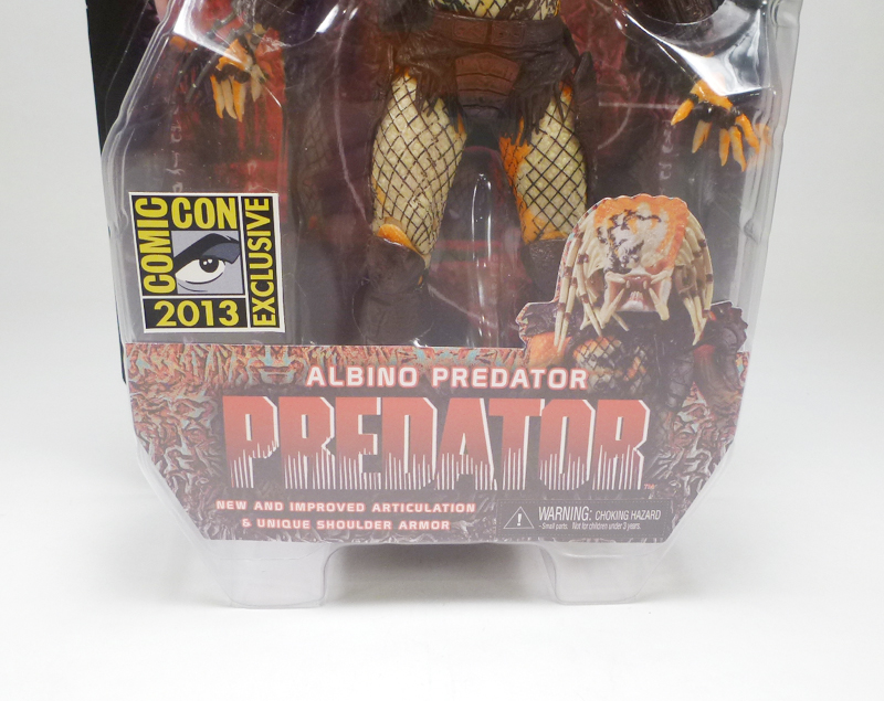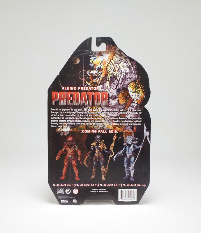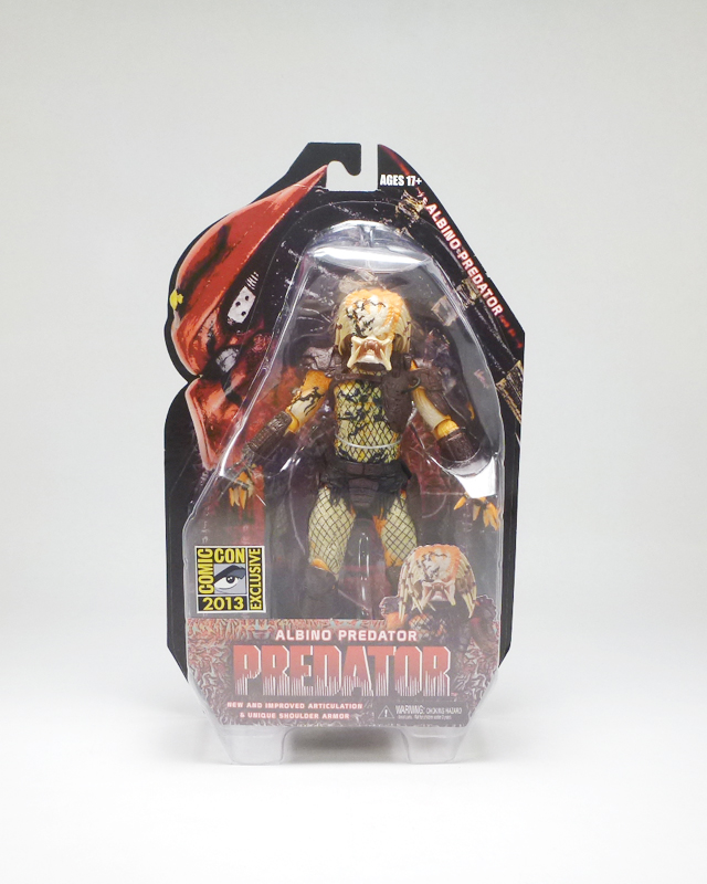 Among NECA’s exclusives at this year’s Comic-Con was a very unique alien warrior from the company’s hit line of Predator figures, the Albino Predator! An original design based on a Predator in the fan film Dead End, the Albino fits right in with the recent imaginative colors and designs in the standard figure line. This exclusive came in standard Predator packaging, the figure encased in a plastic bubble attached to a tall J-hook card. In front of the figure is the series title and this character’s name along with the SDCC exclusive logo and the notation that it has “New and Improved Articulation & Unique Shoulder Armor.” The back of the card has neat artwork of the Albino plus a brief bio; apparently the genetic mutant is a pariah but part of Big Red’s clan, keeps to the shadows, and prefers to fight hand to hand with extreme ferocity. The card also shows off figures coming in Fall 2013.