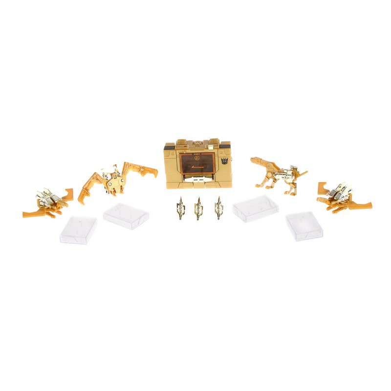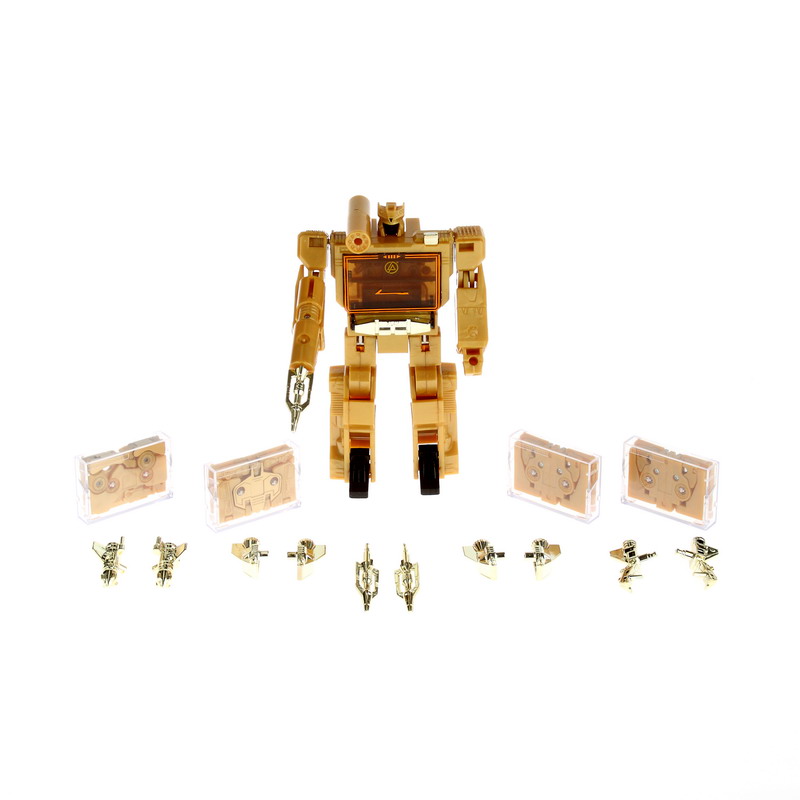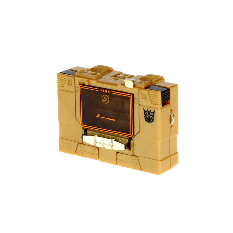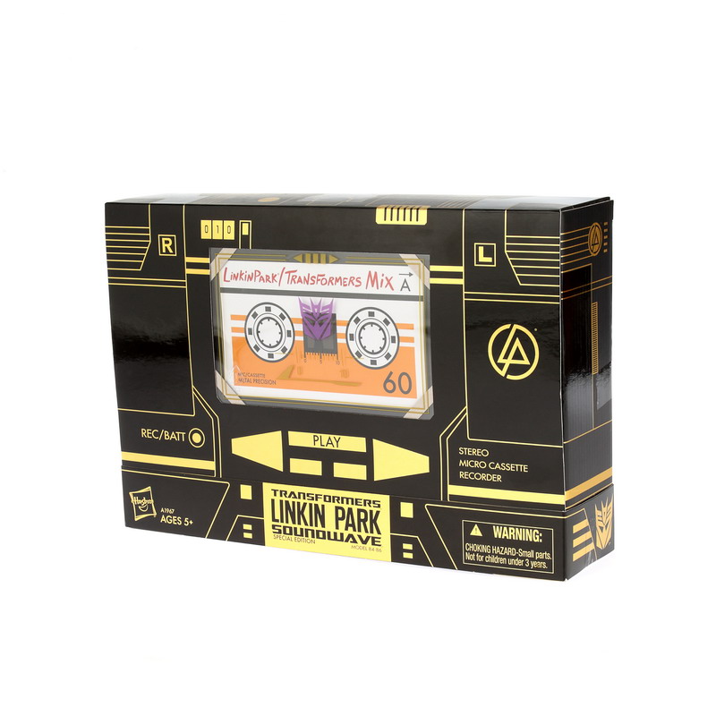 The LINKIN PARK special edition figure is in the “Generation 1” or “G1” style of the fan favorite Soundwave Transformers character, features a gold deco treatment and is packaged in a unique cassette tape-inspired box. “Linkin Park chose the Soundwave character in the ‘G1’ style for his retro-appeal,” Hahn continued. “In the original animated series from the 80’s, Soundwave converts into a tape deck, has cassette tapes as minions and battles the Autobots with blasts of sound; he was an easy choice to represent our band.”