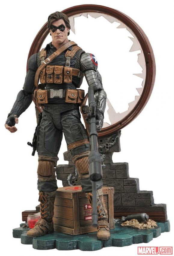 Diamond Select announces, via Marvel.com, that the Winter Soldier will be the next comic-based Marvel Select figure to hit the Disney Store. Sculpted by Jean St. Jean, the comic-based Marvel Select Winter Soldier action figure will be exclusively available at the Disney Store, DisneyStore.com and MarvelStore.com starting in mid-December. The approximately seven-inch figure has 16 points of articulation and comes with a pistol, machine gun and sniper rifle as well as a shattered window display base.