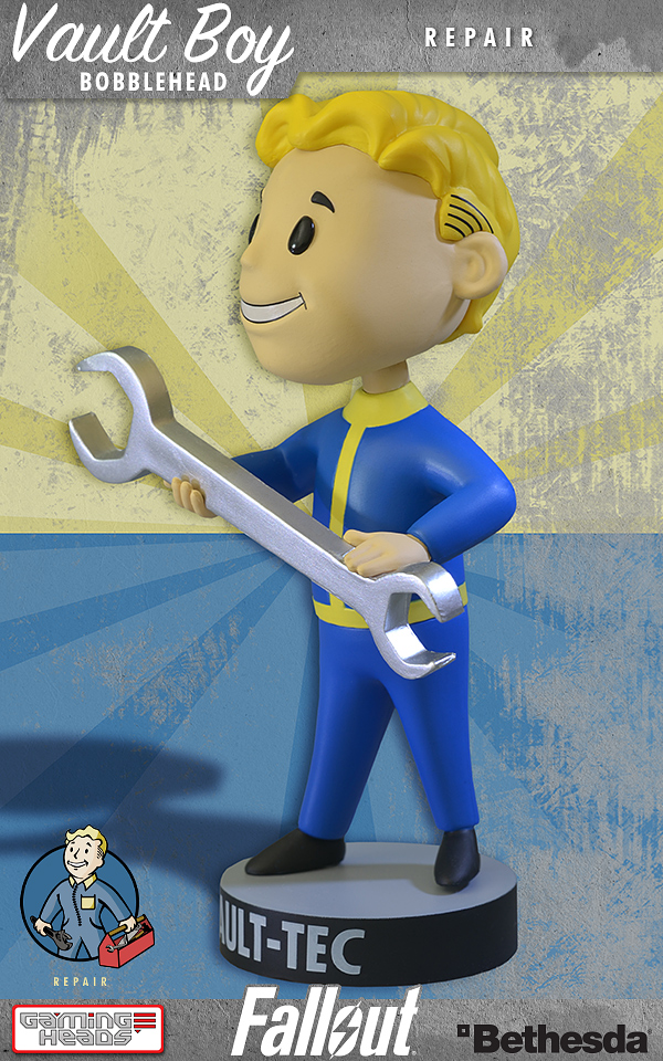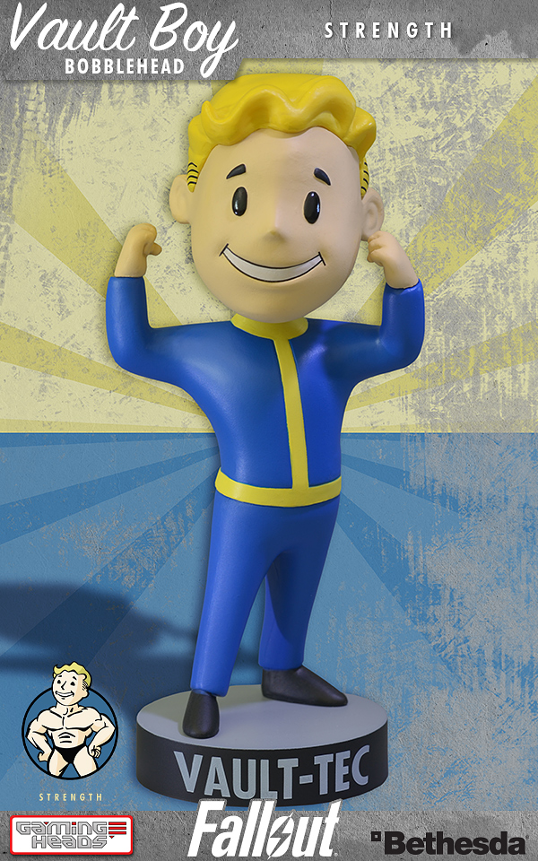 Wow! It took over five years to get done, but one of my longtime Fallout 3 wish list items is finally becoming a reality (read my 2009 Where's My Figures of FALLOUT 3? story HERE). Gaming Heads present a new range of collectible Vault-Tec Vault Boy Bobbleheads from Fallout 3! Series One includes Strength, Melee Weapons, Energy Weapons, Perception, Endurance, Lock Pick and Repair. Fans of the game will recall that there are 20 bobbleheads to collect. Gaming Heads plans on producing them all.
