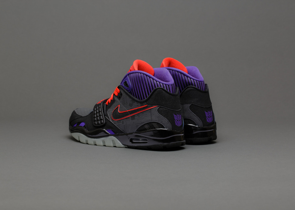 Complementing the Nike CJ81 Megatron Trainer Max, the Megatron Nike Air Trainer SC II draws more muted inspiration from the Transformers character. A tonal, reflective circuitry board pattern is featured on the medial and lateral quarter panels, and like the Nike CJ81 Megatron Trainer Max, the Decepticon logo appears welded at the heel. Premium Nubuck is used at the overlays, and a glow-in-the-dark outrigger punctuates the sole tooling. The final Transformers inspired flourish is a removable strap across the upper.
