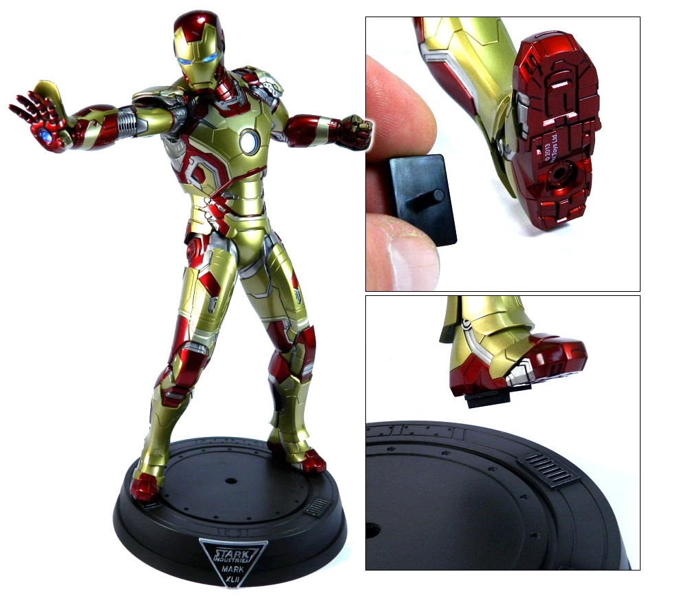 Your other "Power Pose" display option is a little bit more layered, but no less complex. Start by popping off the entire right leg from the ball joint. From there remove the lower leg and plug it into the alternate thigh portion included with the figure. Pop the leg back on and presto - Iron Man's right leg is now straight for a new "standing" pose. Where the clear rod helped Iron Man fly, two black plastic pieces that plug into each foot help Iron Man stand. At first the pegs appear a smart solution, but the end result is overly awkward. Small figure parts like this always tend to get lost and the extra step of putting them on the figure just strikes me as an unneeded step. Further frustrating the situation is aligning Iron Man's newly pegged feet with the grooves on the base. A better solution for future figures would be strong magnets in the feet and base.