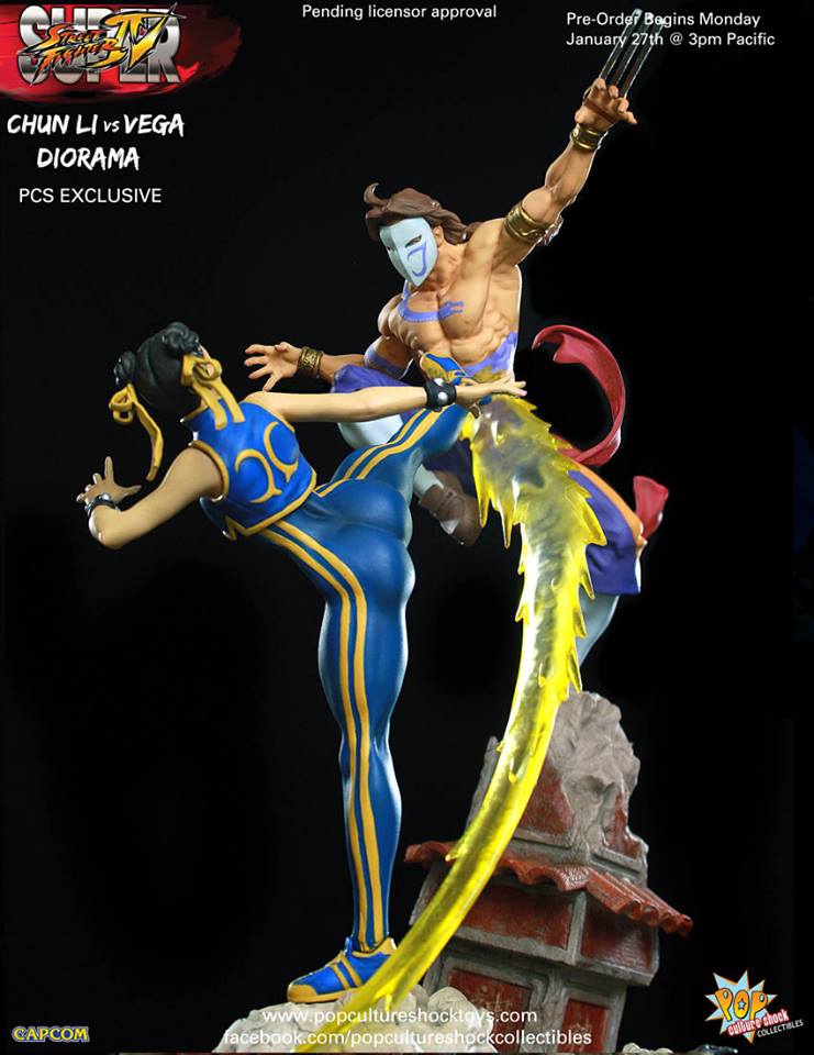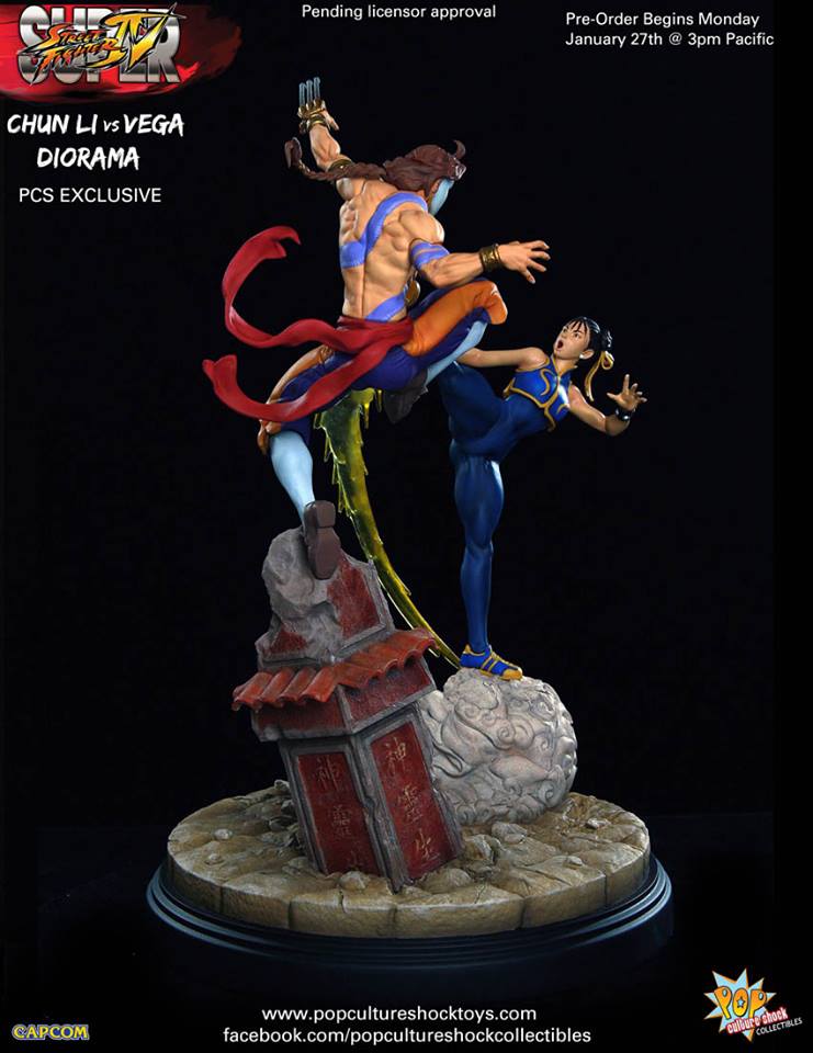 Pop Culture Shock presents their latest Street Fighter collectible, a 15" tall CHUN LI vs VEGA DIORAMA. Like all PCS releases, two versions will be offered: a standard edition (pictured above) priced at $345 and limited to 450 pieces, and a PCS Exclusive (below) priced at $379 and limited to only 200 pieces. The latter includes both Classic Chun Li and Alpha Chun Li which are interchangeable on the base.