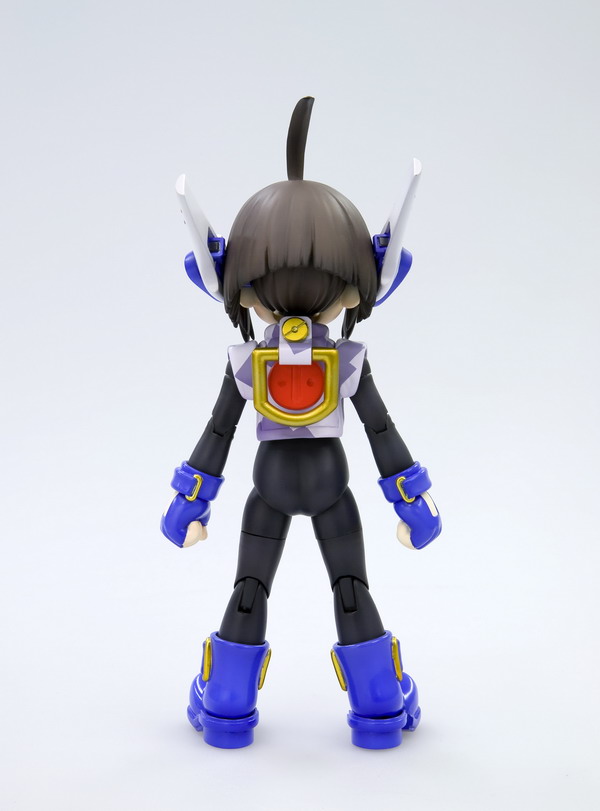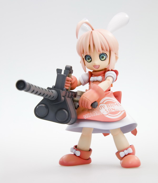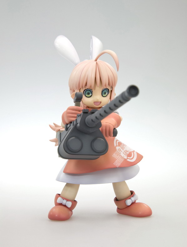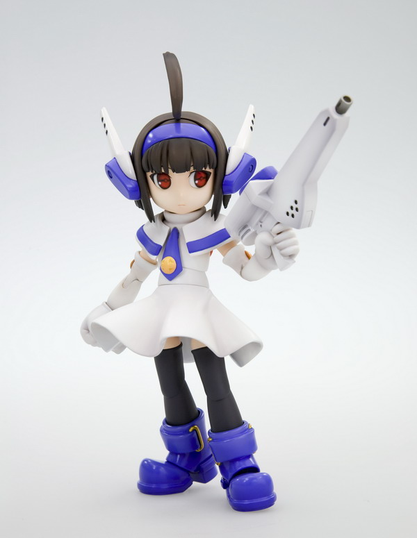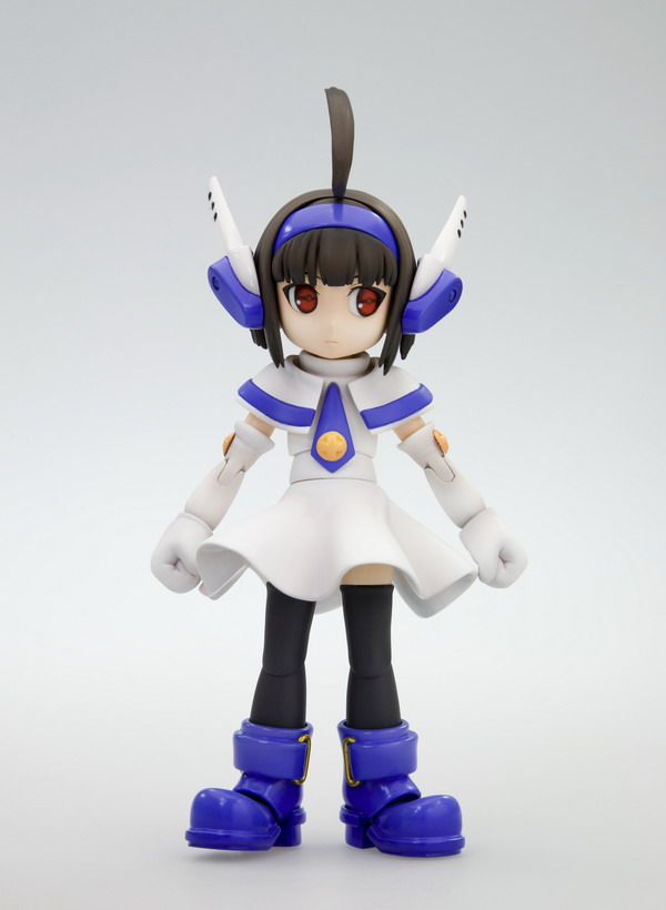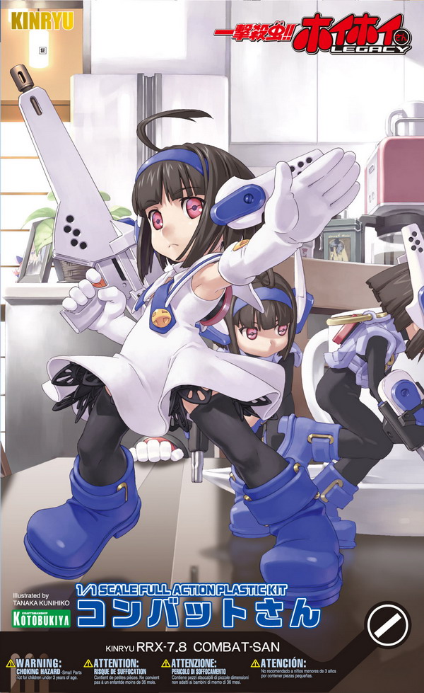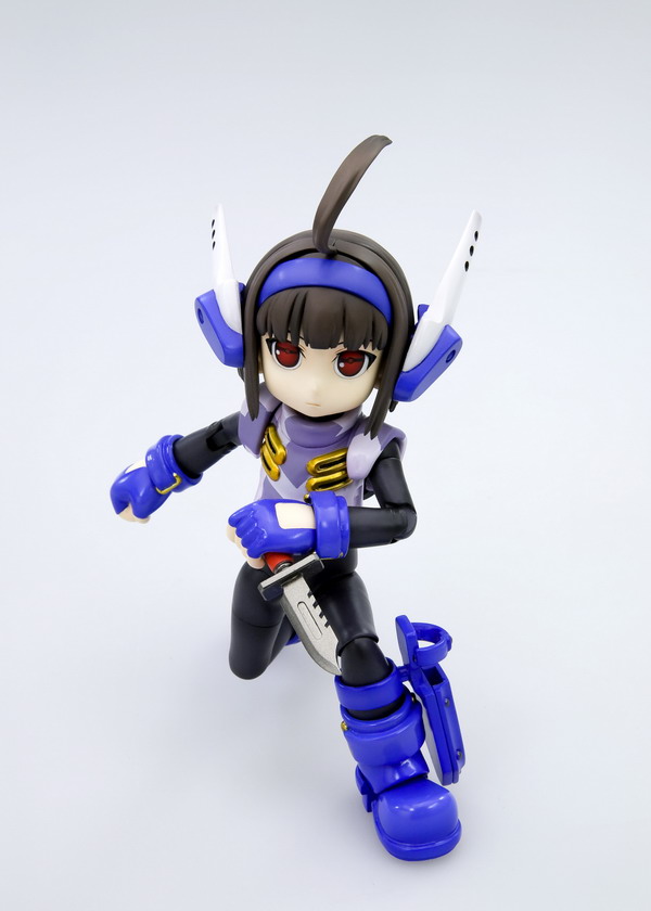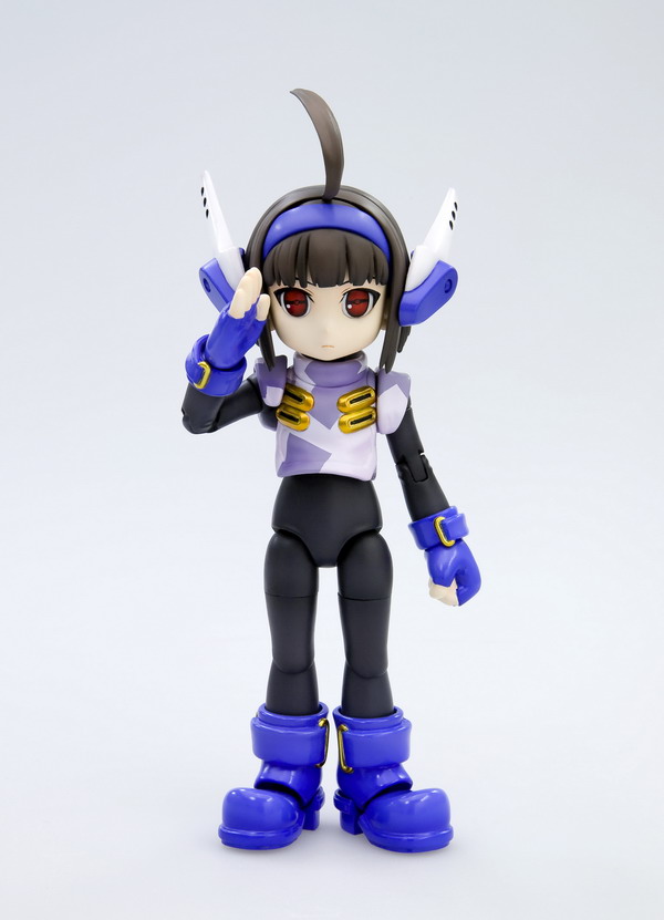 At approximately 5 inches tall this new version of Combat-san trades in her previous Western style dress and leggings for a high-tech tactical suit based on Kinryu's Special Forces design complete with heavy combat boots and fingerless gloves. Combat-san's stern face is all business, and she wears a heavy-duty headband with dual antennae. Her arsenal consists of a "Grind Frame," combat knife, "Sundome-Kun," and magazine pouch.