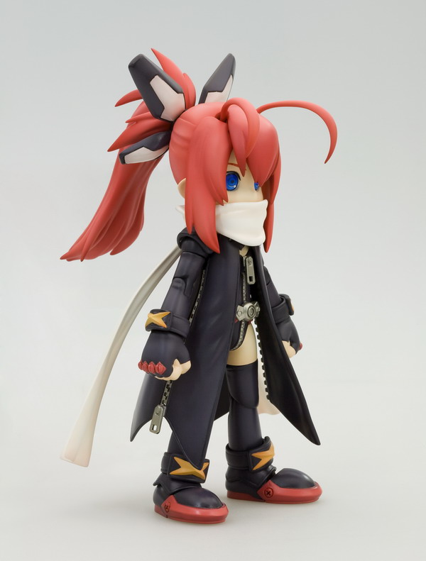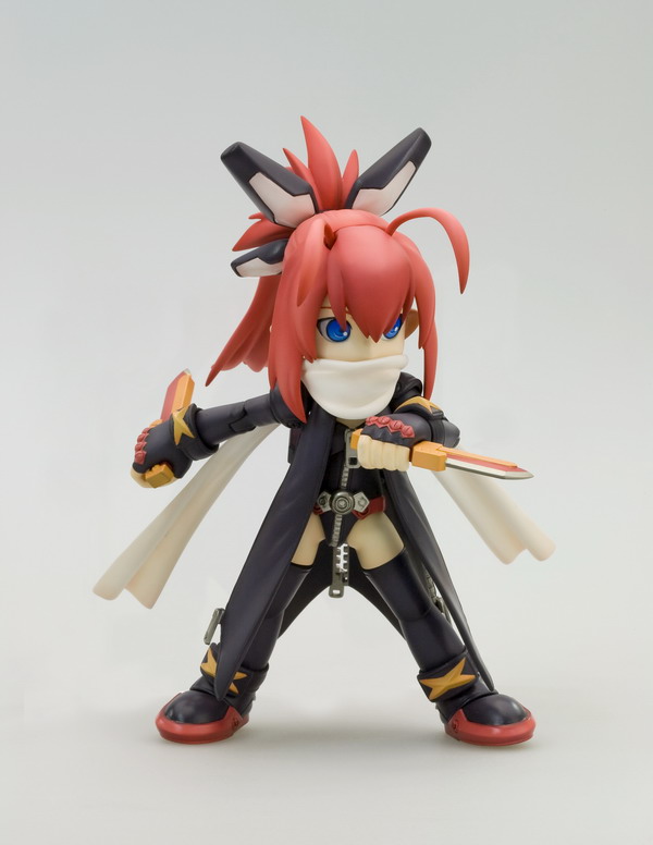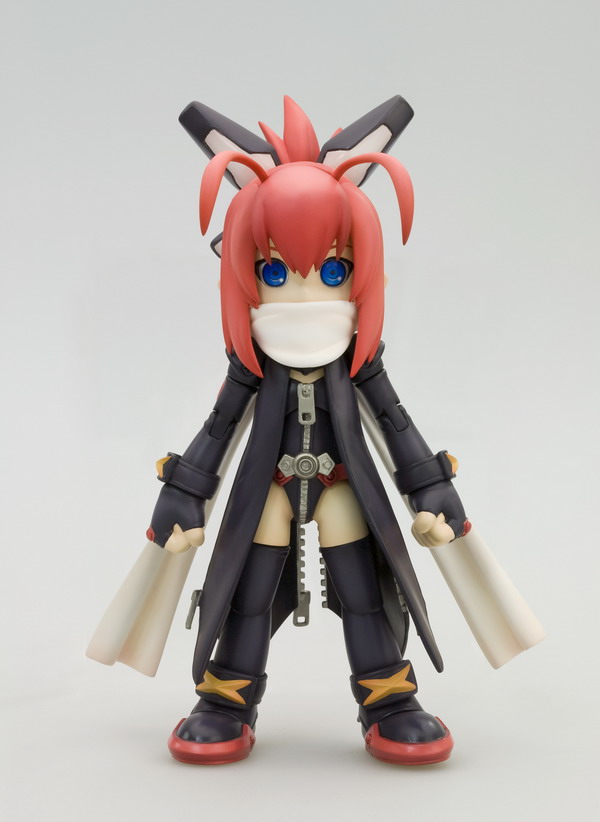 Unlike the cute Hoi Hoi-san, the 5 inch tall Pest-X wears a striking leather-inspired black outfit complete with silver zippers, thigh high boots, and fingerless gloves. Her face is covered by a long white scarf while her bright red hair is held in place by an intricate mechanical device. Ready for miniature battle, Pest X wields dual knives that can be stored in sheaths on her back. While the little robot’s huge blue eyes look cute, pull down her scarf to reveal a wicked grin.