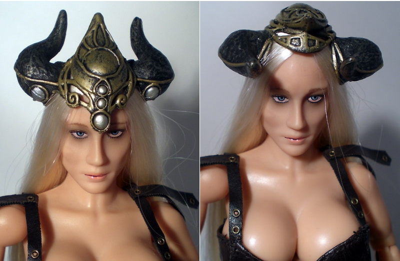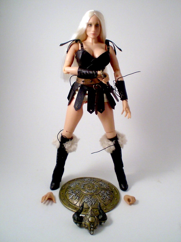 SCULPT/ACCESSORIES: Helga's body consists of the new Triad Alpha female 1:6 scale body. The head portrait features rooted Saran hair and looks highly realistic. The figure features several impressively crafted accessories such as the ornate shield and Viking helmet. All the weapons and accessories are intricately detailed and on par with the quality of other 1:6 figure companies such as Sideshow and Hot Toys.