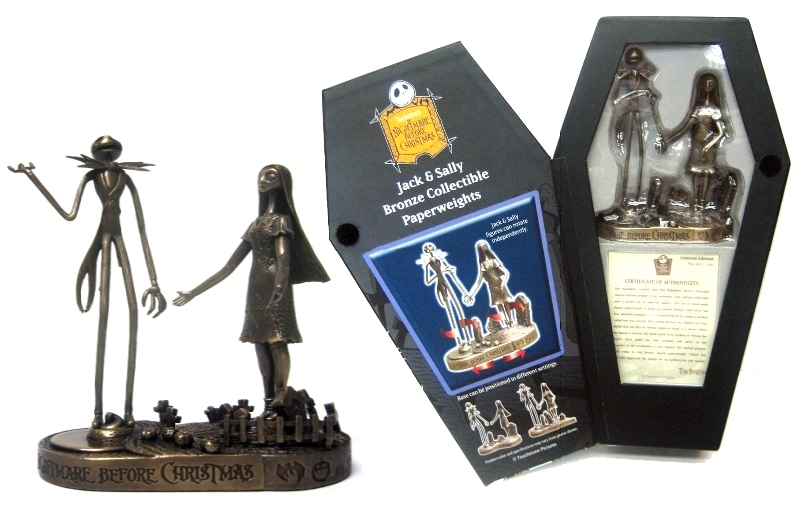 * The Nightmare Before Christmas - Jack and Sally Bronze Paperweight- 1st Series - Jack stands 5 1/4" tall and Sally stands 4 1/2". Both come packaged in sturdy coffin shaped box. The two separate paperweights, when joined, depict Jack & Sally holding hands. Limited edition of 20 pieces. $50.