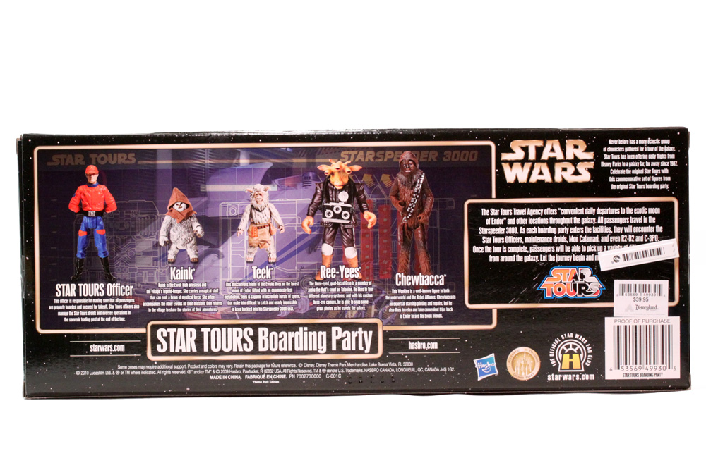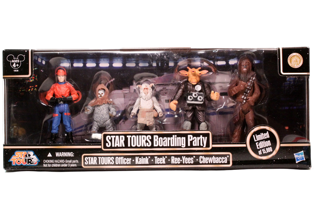 The STAR TOURS BOARDING PARTY is limited to only 15,000 pieces and includes five figures, mostly recycled, but completely worth getting for the one figure that is brand new. The Disney theme park exclusive set retails for $39.95 and includes STAR TOURS OFFICER, KAINK, TEEK, REE-YEES, and CHEWBACCA.