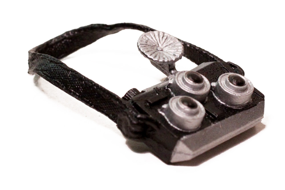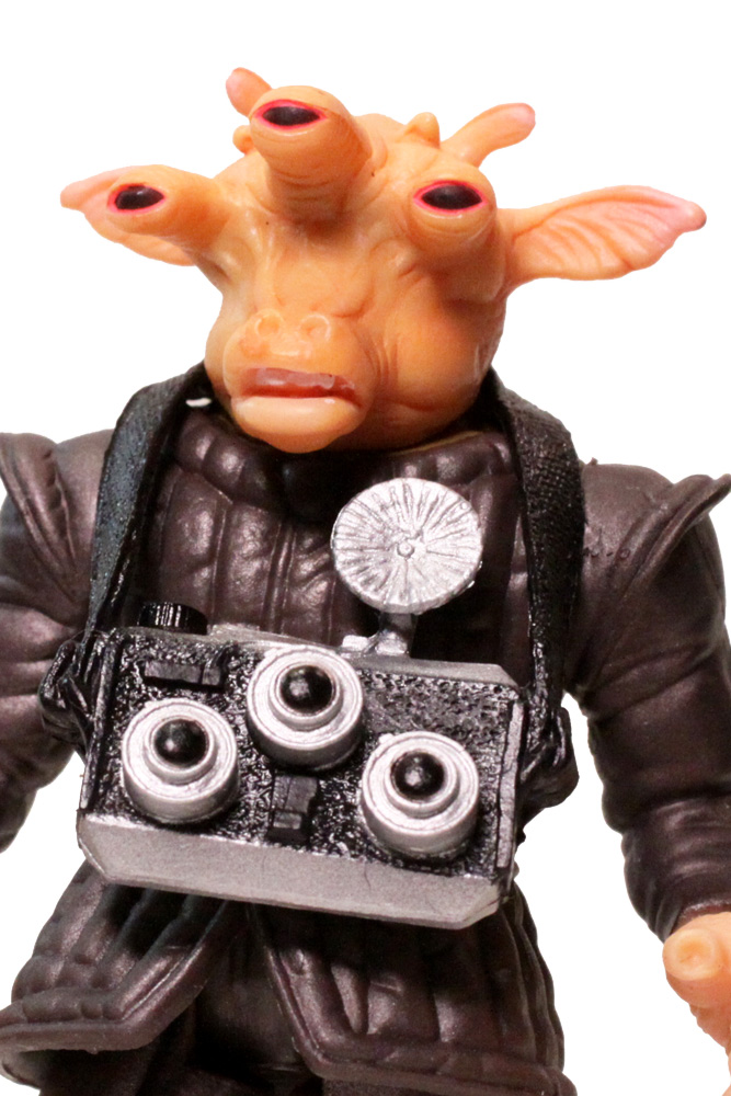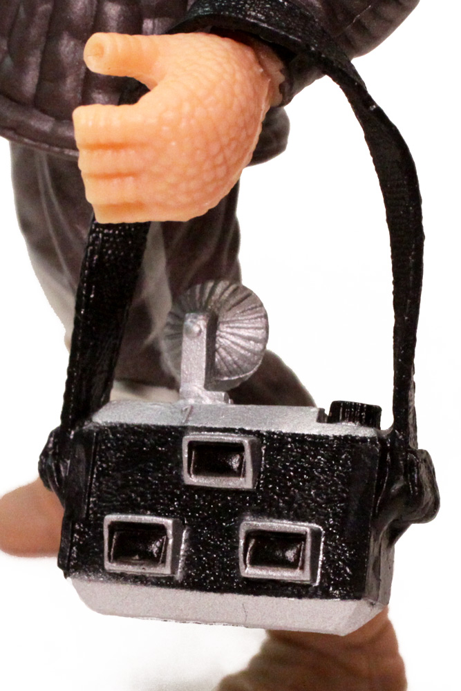And since he has three eyes, his camera has three lens! Funny that our cameras still only have one lens? This accessory is well sculpted, well painted and hangs nicely around his neck. The problem is with the basic POTF2 body, he won’t be able to take any real pictures since his hands aren't capable of holding his own camera.