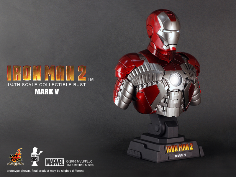 Hot Toys continues their extensive collection of Iron Man 2 movie collectibles with a new 1:4th scale bust: Iron Man Mark V. The "Suitcase Suit," as it is lovingly referred to by fans, measures approximately 9.5 inches tall and features LED light-up eyes and heart (white light, battery operated - 3 "AAA" batteries not included). Scheduled for release 3rd quarter 2010, the Mark V bust joins the previously announced Mark IV, Mark VI (summer convention exclusive), and War Machine busts.