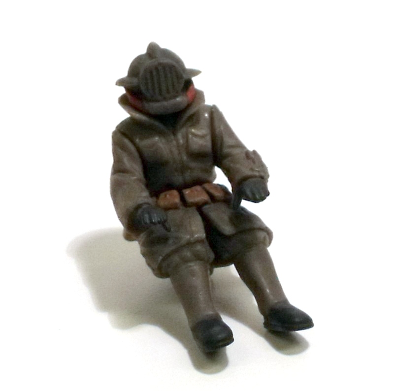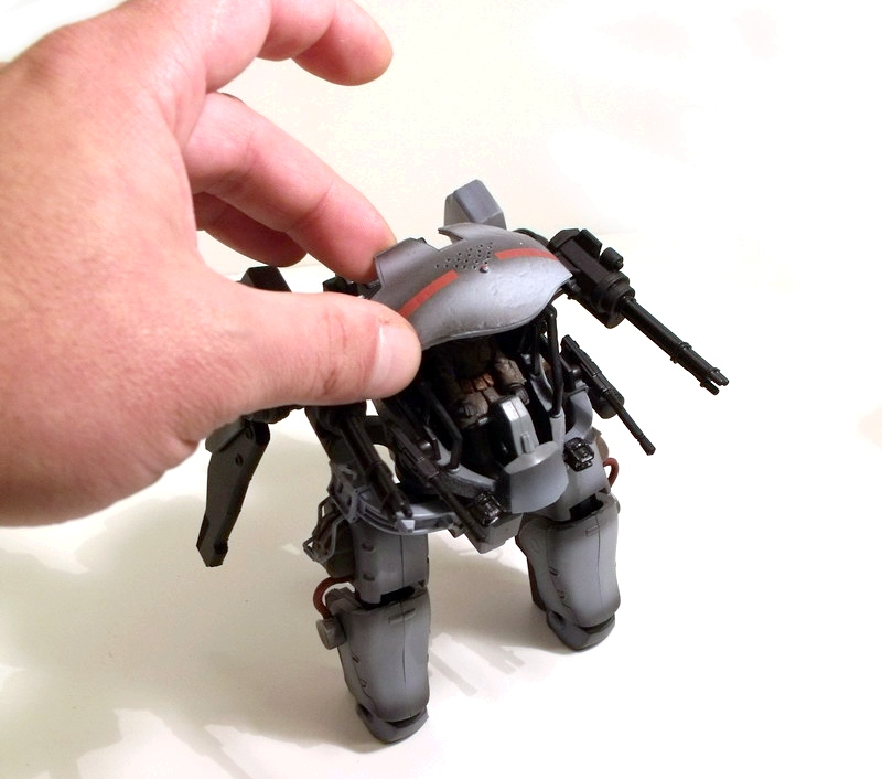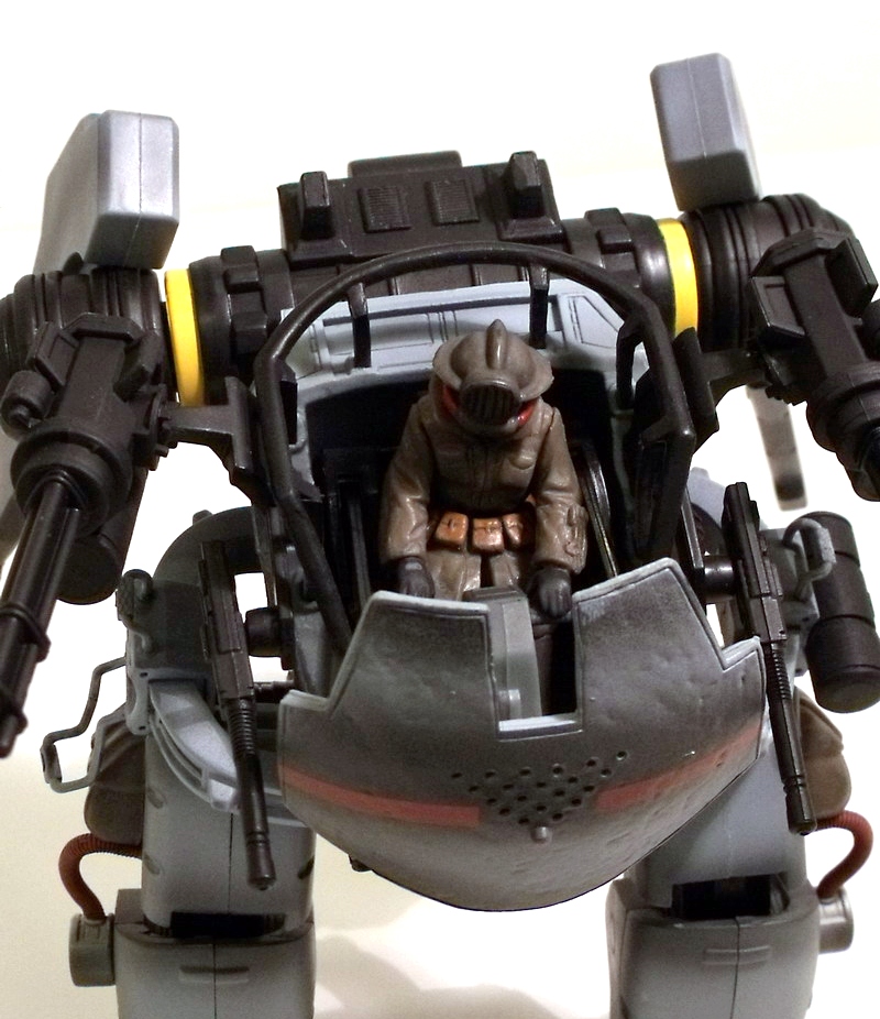 Like the Hardballer, bolts and panel lines are everywhere on this mech, all sculpted with robotic precision. The Drio ups the sculpted ante by adding a seated pilot and tacked-on gear, such as gear pouches and canisters. The soldier is removeable, but he's not made to act as a free standing figure. He's permanently seated, but he looks very good doing so.