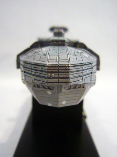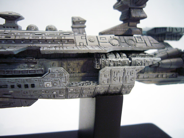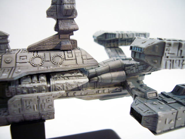 As near as I can tell the two Rodger Youngs have the same sculpt with the exception of the radio tower, and that's a very good thing. At first glance the ship has a fairly traditional cylindrical shaped hull with a blunted nosecone and four outrigger-style engine pods. But, look closer and you'll find a wealth of technological details. Everything is sculpted, from ridges to ports, bays to gun emplacements, and a multitude of panels, spheres, circles, etc.