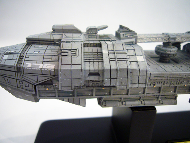 Finally, on either side of the forward section is a pre-attached decal with the number 176 and "Rodger Young" in tiny letters. The subtle variations in the colors and patterning really bring the ship to life, especially on display next to the first version.