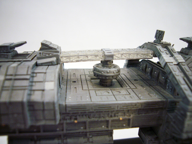 One of the coolest parts is the dorsal section just aft of the bow. In the center of an open area is a round tower that anchors a flying bridge linking the bow to a half ring around the ship's central section. That bridge even has translucent plastic "windows" which look great. Of course, this version is unique for its radio tower design! Rising up from the dorsal side just ahead of the engine section, the original tower consisted of three boxy elements side by side. The new version has the same base, but is topped by a wider structure with angled protrusions on its front and sides.