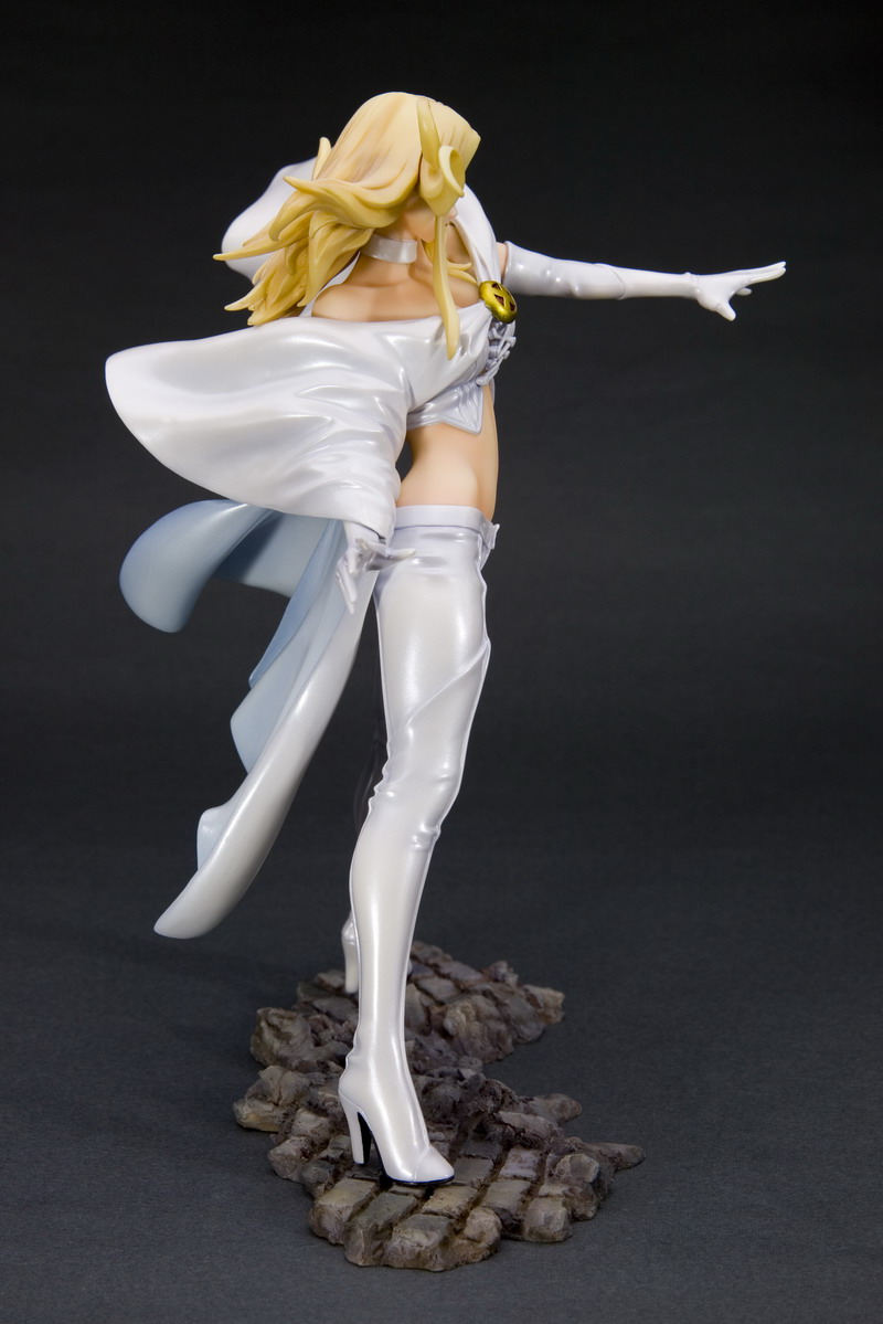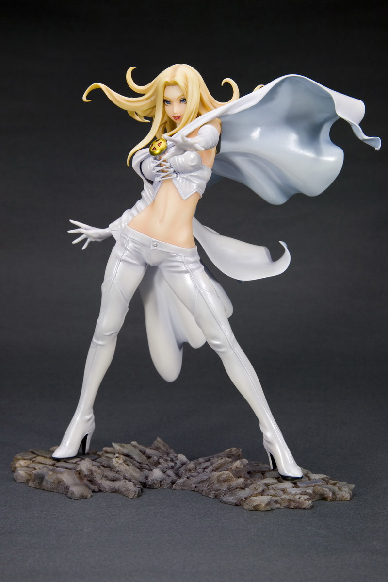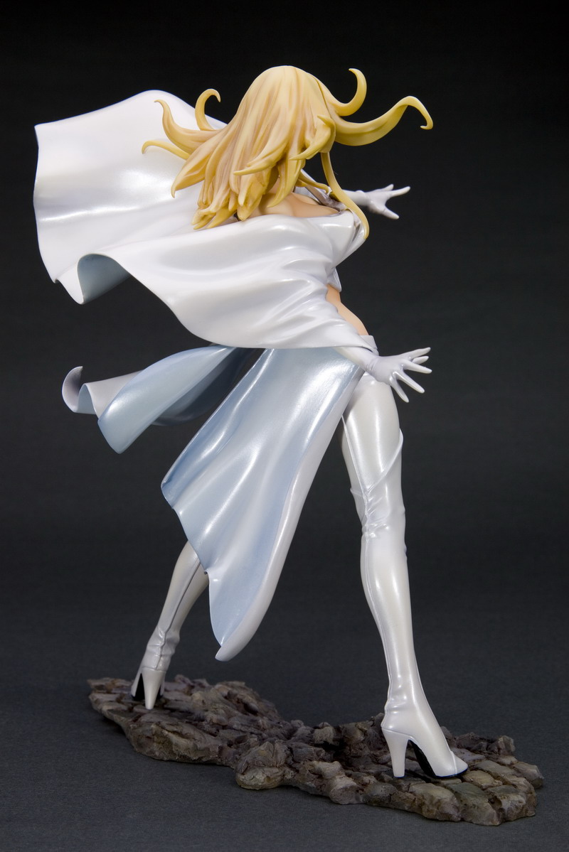 Sculpted by Takashi "GILL GILL" Tsukada, Emma Frost stands approximately 8 inches tall (in 1/8 scale with the other Marvel x Bishoujo statues) atop an exclusive environmental display base and is constructed of high-quality PVC plastic.As any X-Men fan can tell you, Emma Frost is hot! It's no wonder then that the powerful mutant makes for one sexy Marvel X Bishoujo beauty. Standing her ground with a wide stance, the former White Queen smiles slyly as she reaches out with her left hand, no doubt manipulating your mind even as you take in her beauty. Frost's well known skimpy costume is in full effect, with particular attention paid to the details on her tightly knit top. The mutant's amazing sculpt is highlighted by a striking Bishoujo-styled face and billowing hair and cape that add a dynamic flair to an already eye-catching pose!
